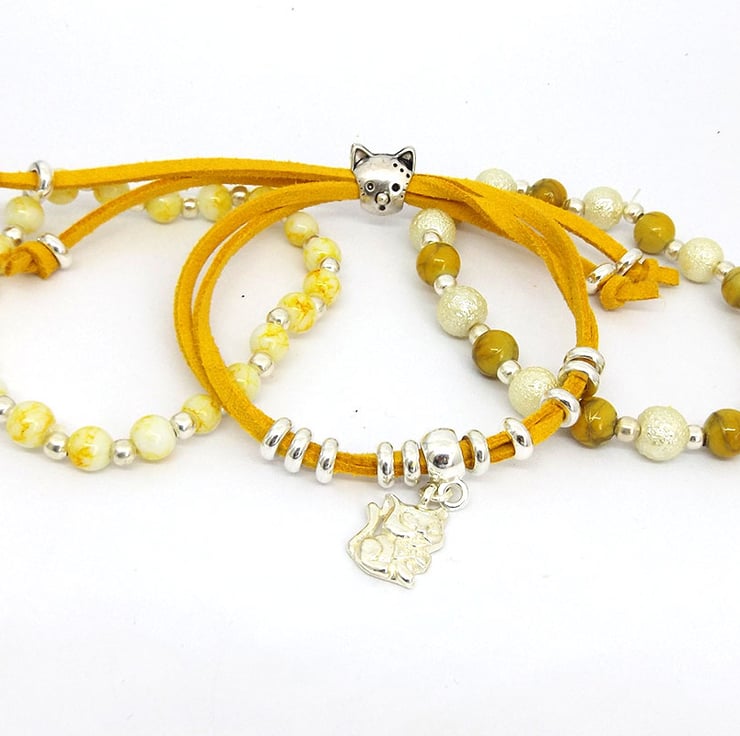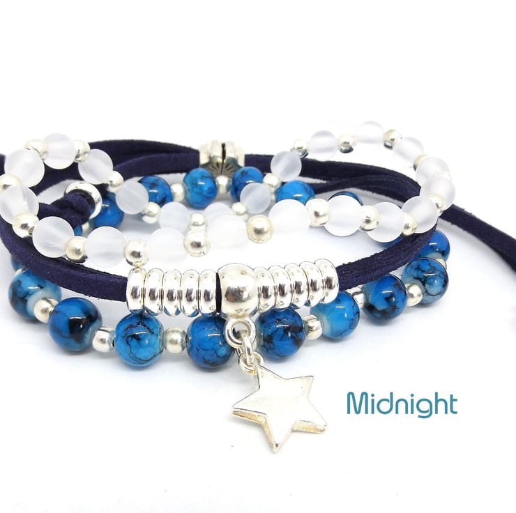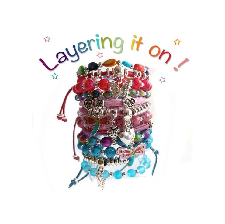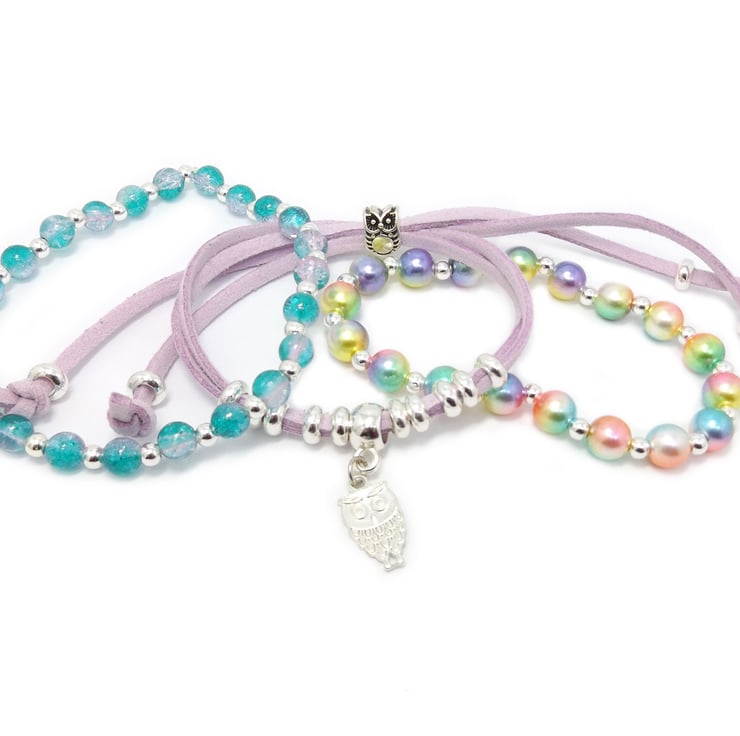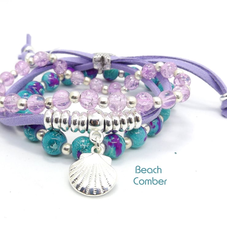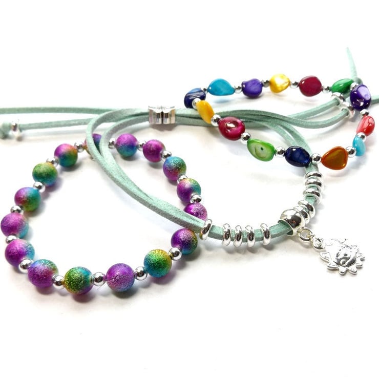 The three bracelets (2 stretchy beaded bracelets and 1 suedette charm bracelet) can be worn individually or stacked up on the wrist for a trendy bohemian look. (See the single kit listings for more details: )