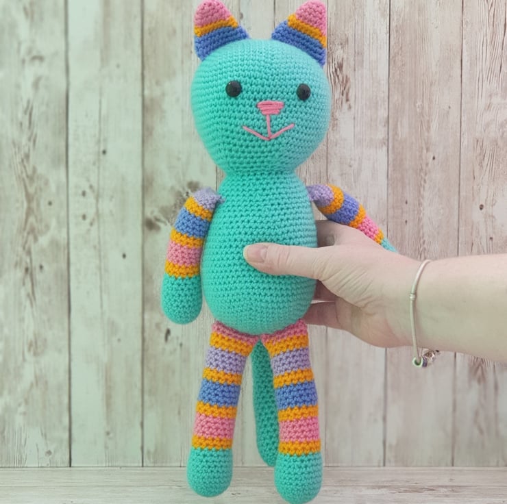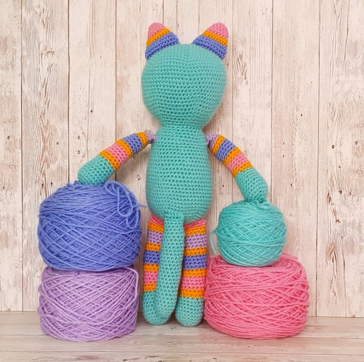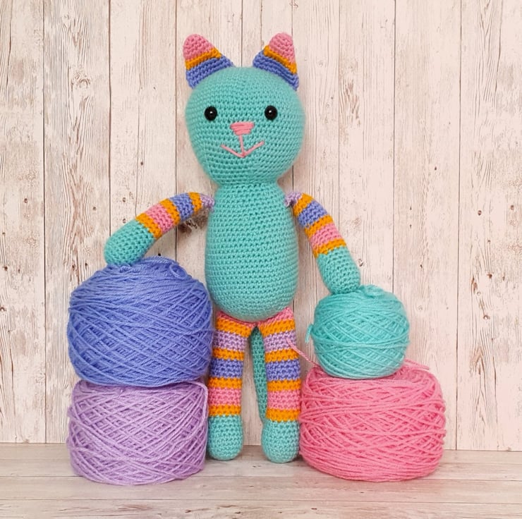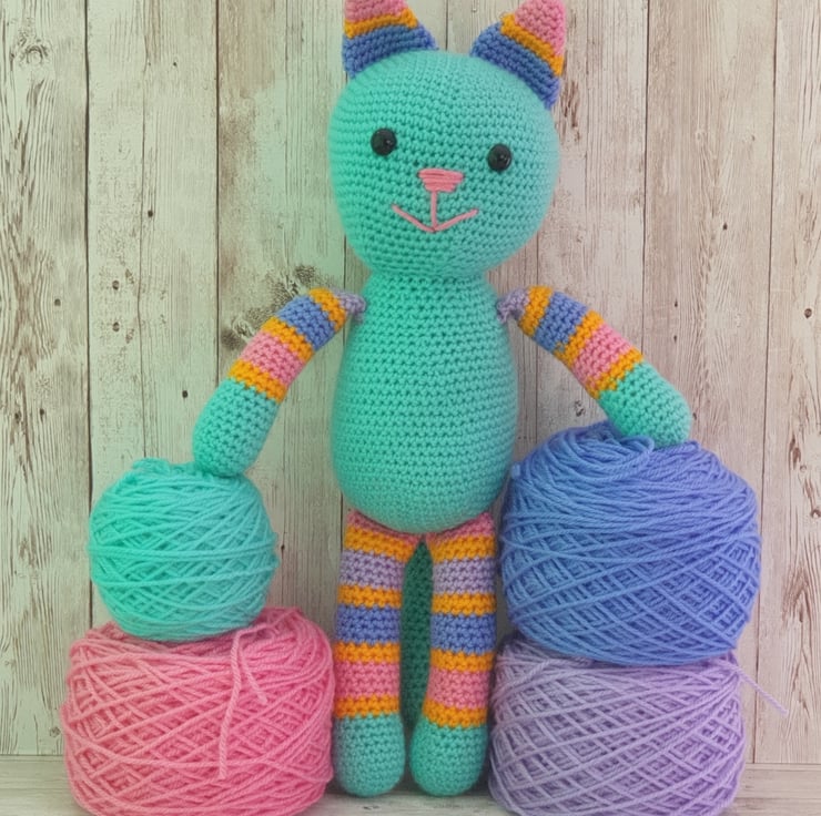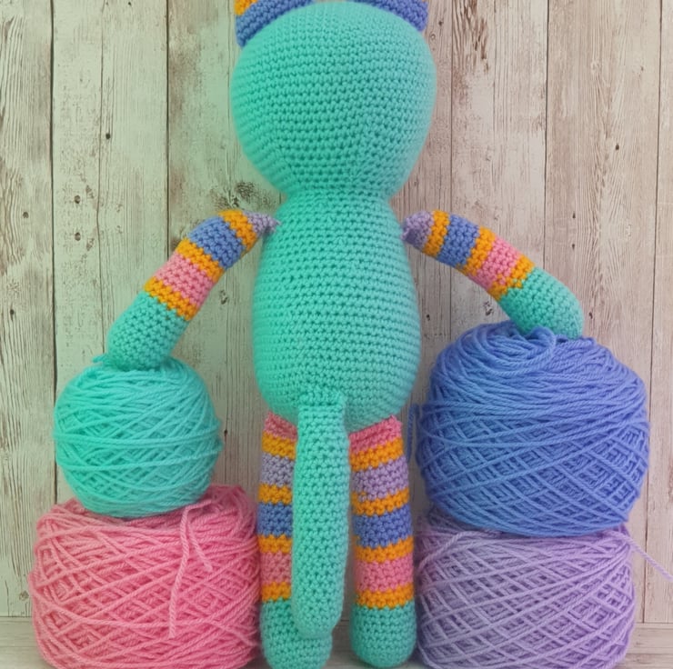 She is crocheted from lovely soft acrylic yarn. Her main colour is almost a mint green with stripes of yellow, pink, blue and lilac.