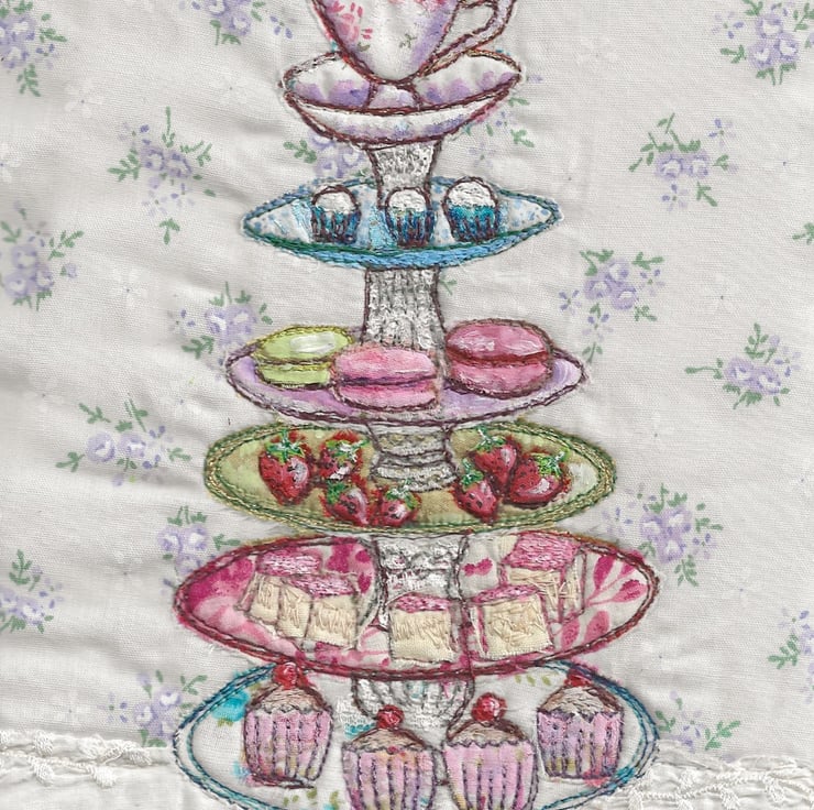 This pretty tiered cake stand card is printed from an original embroidery created by Suzanne Hooson. It is hand finished with glitter for an extra sparkle.