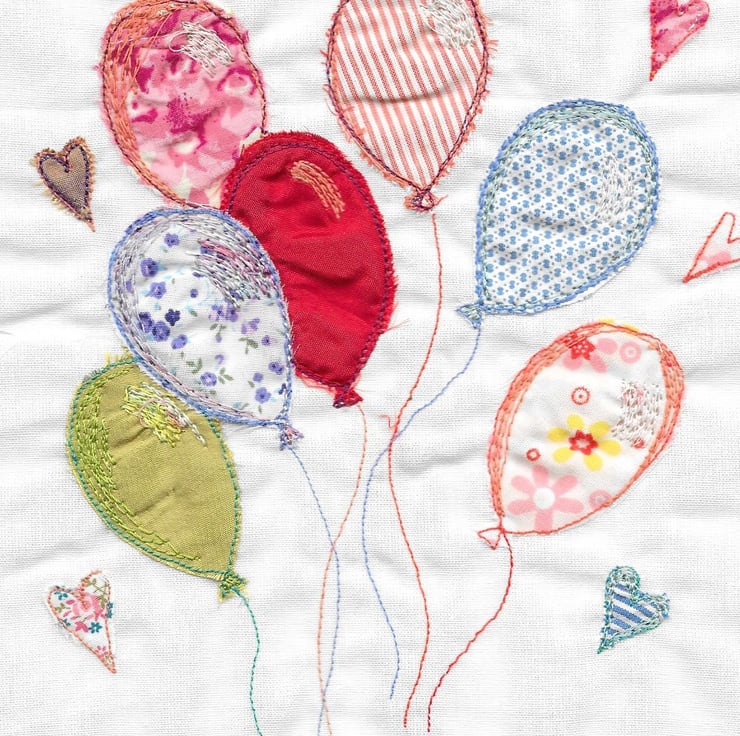 This balloons birthday card is printed from an original embroidery created by Suzanne Hooson. It is hand finished with glitter for an extra sparkle.