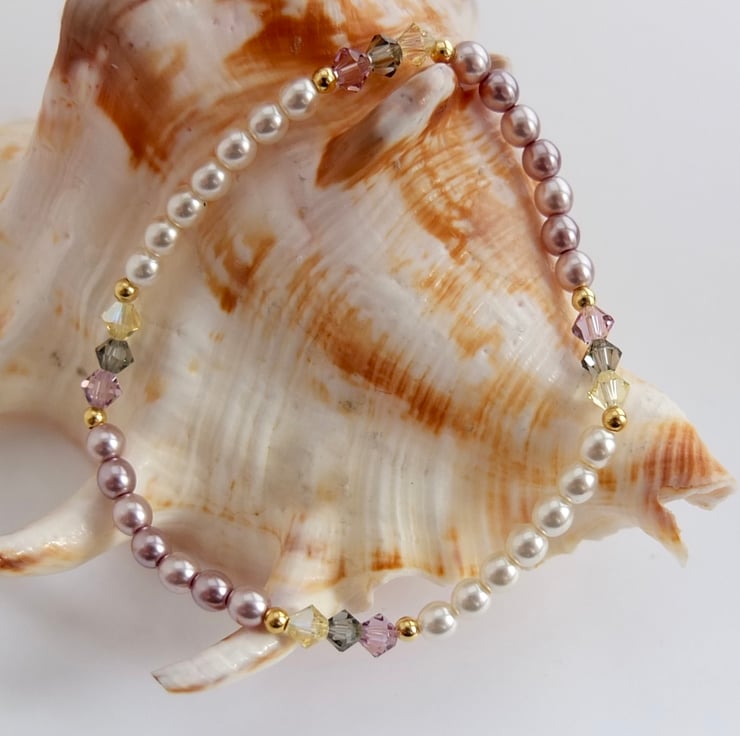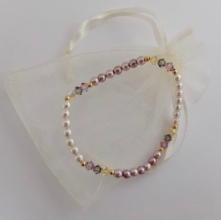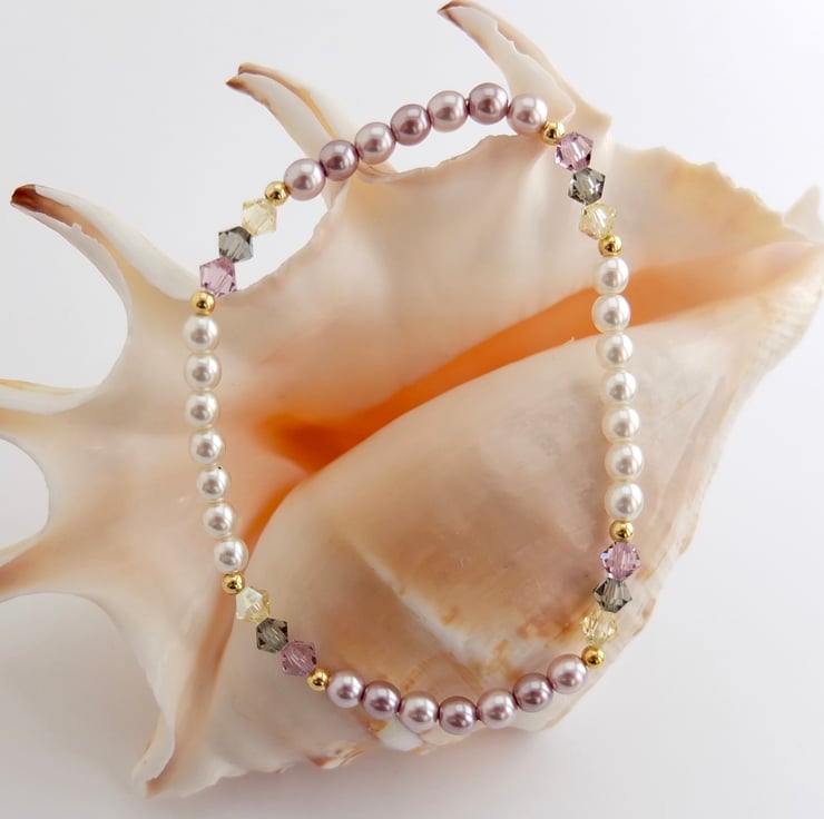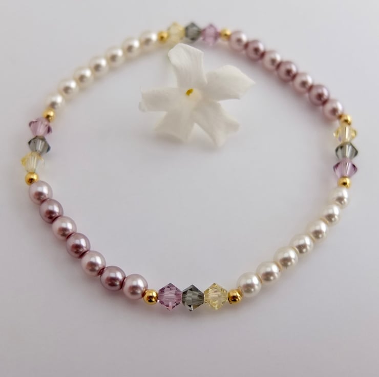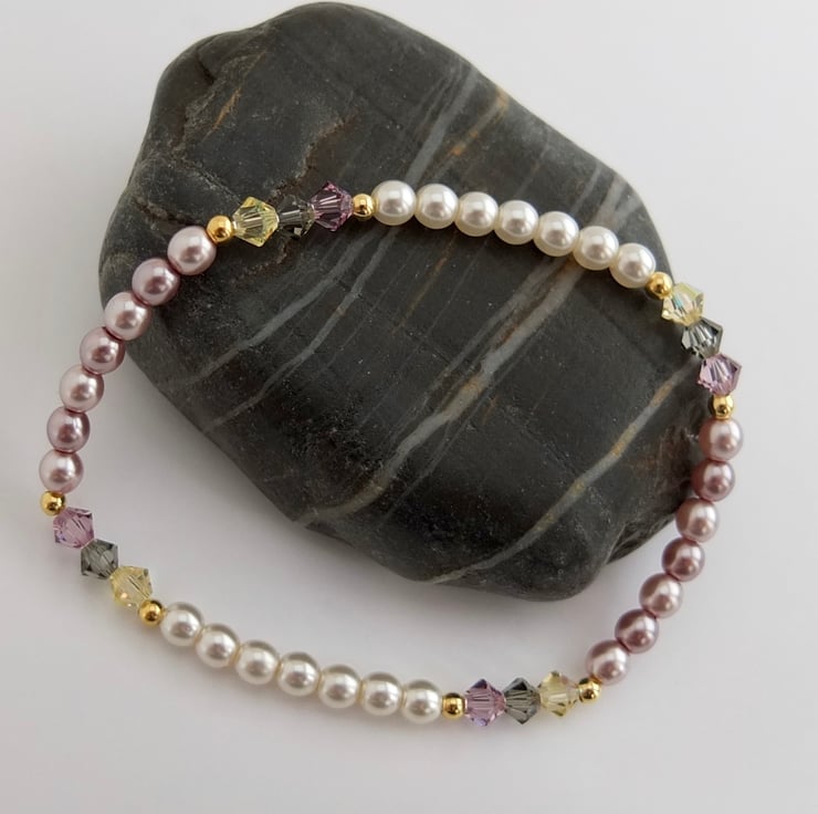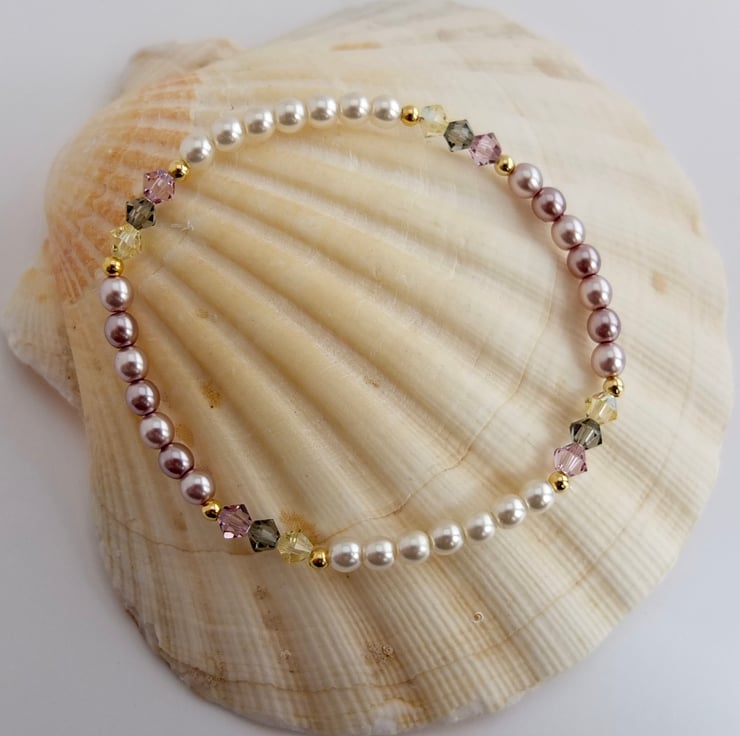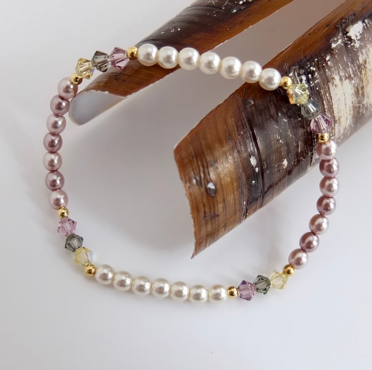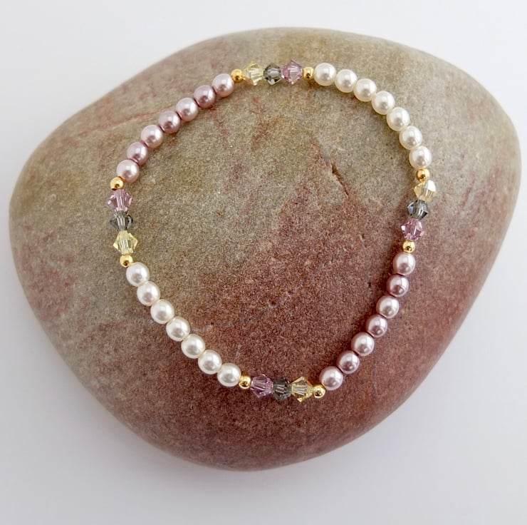 Czech Glass Pearl & Swarovski Crystal Pink & Cream Bracelet - Handmade In Devon