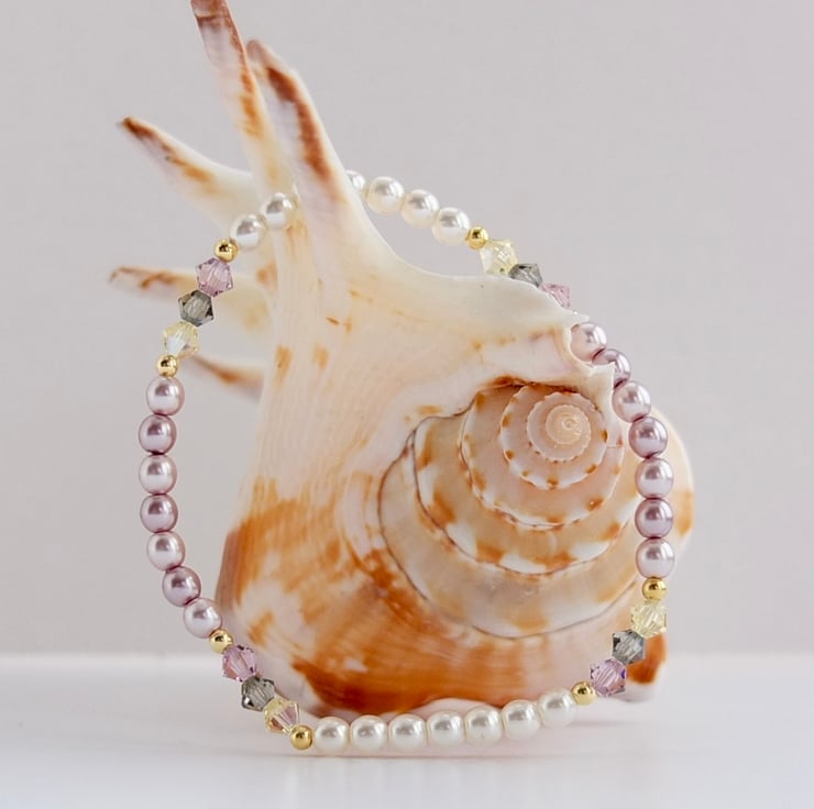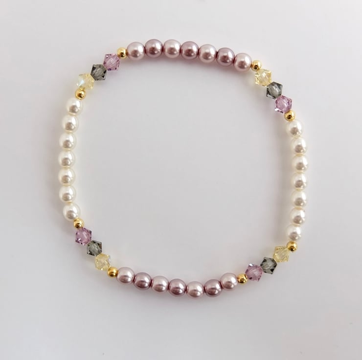 Pretty, delicate, summery stretch bracelet of Czech glass pearls in ivory, dusky mauve and dusky pink.
