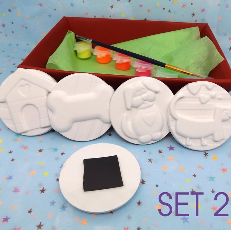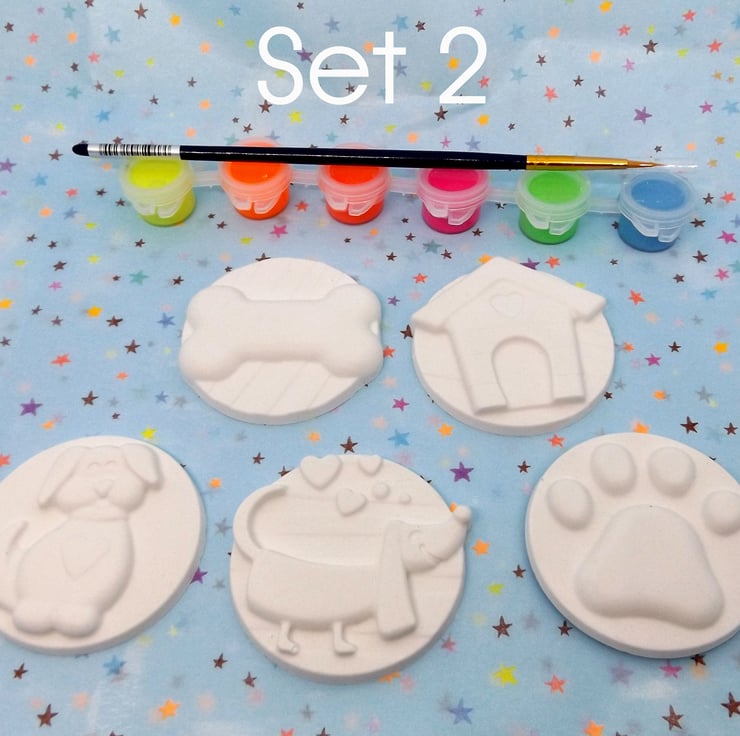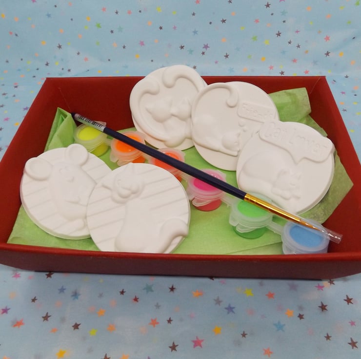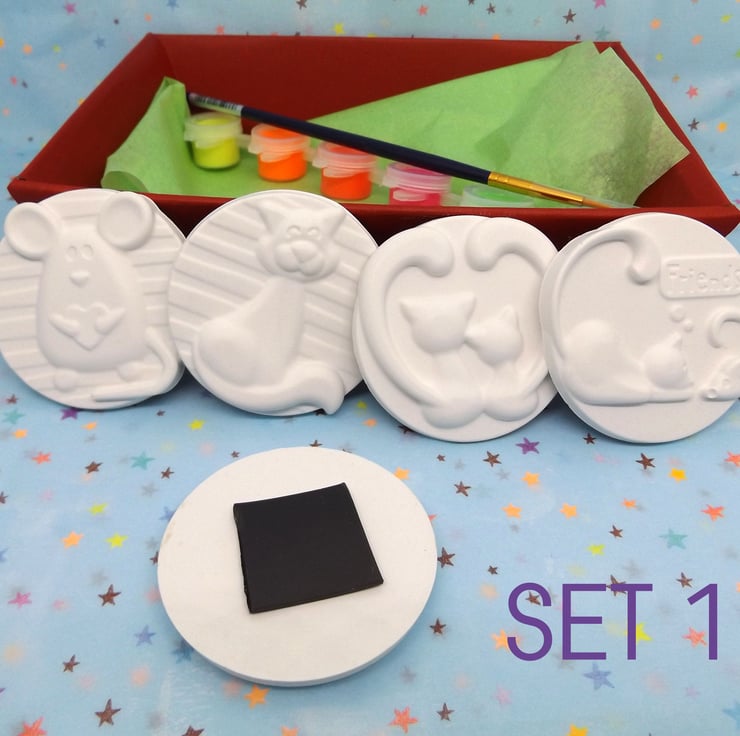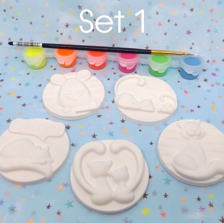 These adorable kit contain everything you need to paint your own designs onto five cute fridge magnet blanks.