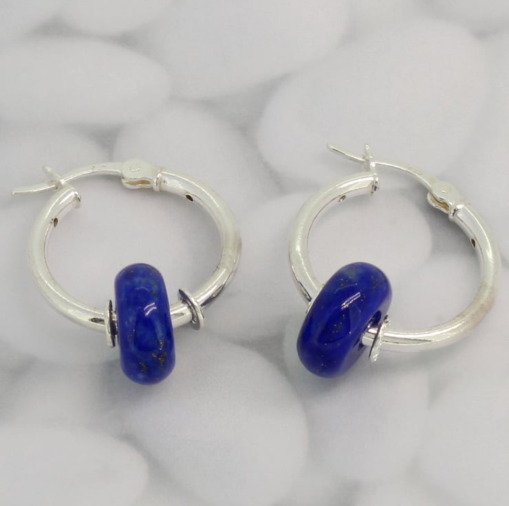 These easy-to-wear earrings have been made by us, in our workshop in Yorkshire. They feature two quality Lapis Lazuli 10mm beads; the holes in the stones are covered with small decorative silver hoops. The sleeper earrings are made from hallmarked sterling silver and measure 18mm in diameter. These Lapis earrings come in one of our branded gift boxes.