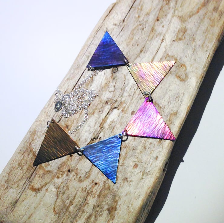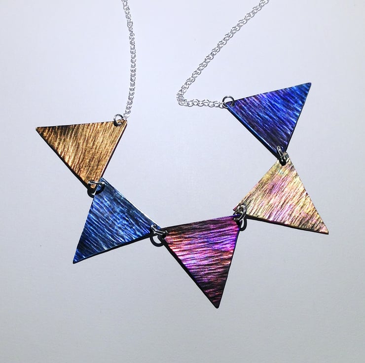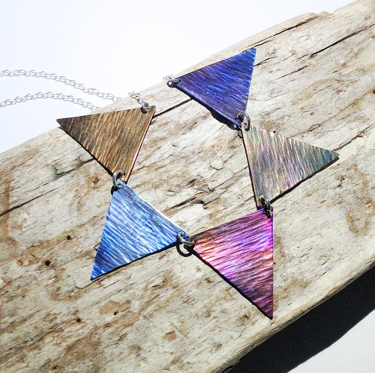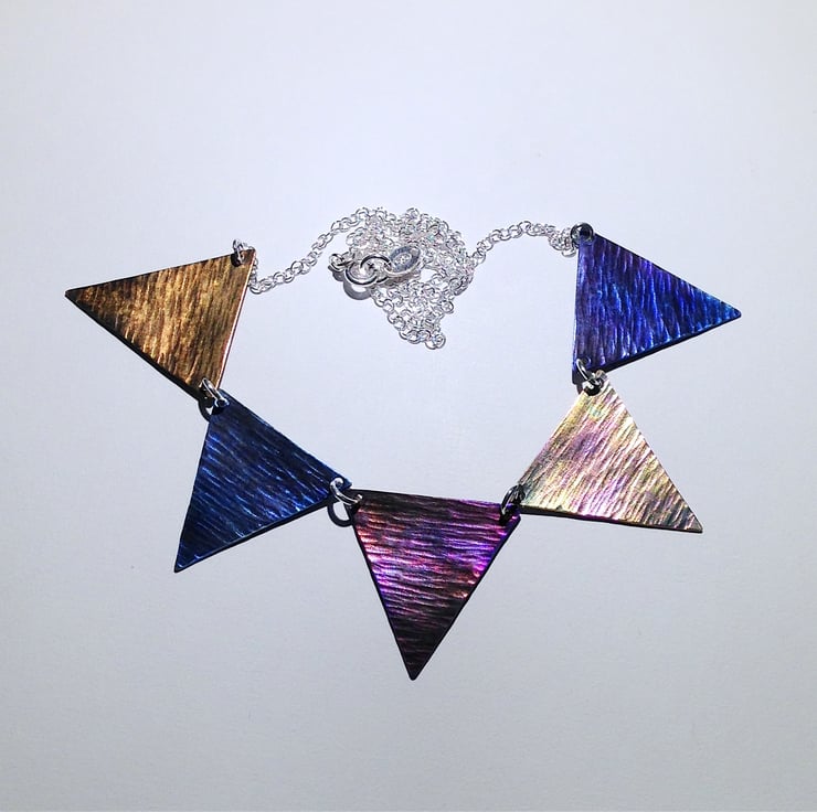 I have made this necklace by hand sawing the shapes from titanium sheet and have given the surface an attractive hammered finish before heat colouring. I have then joined them together with sterling silver jump rings and attached sterling silver chain to create the necklace.