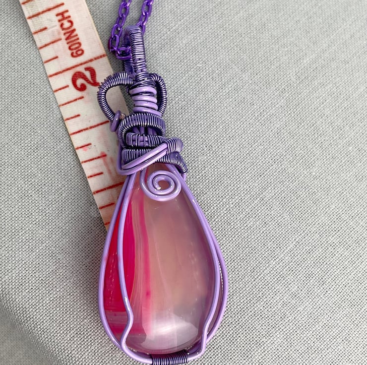 A striking Agate pendant in hot pink natural coloured gemstone which has been wire wrapped with purple coated copper wire. The pendant is suspended from a purple plated copper chain.