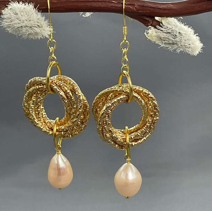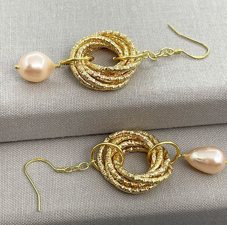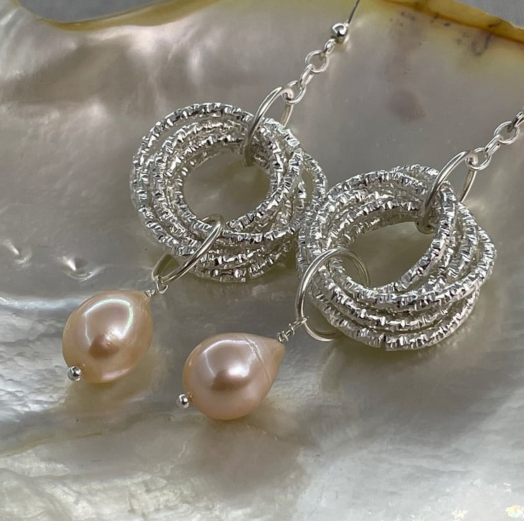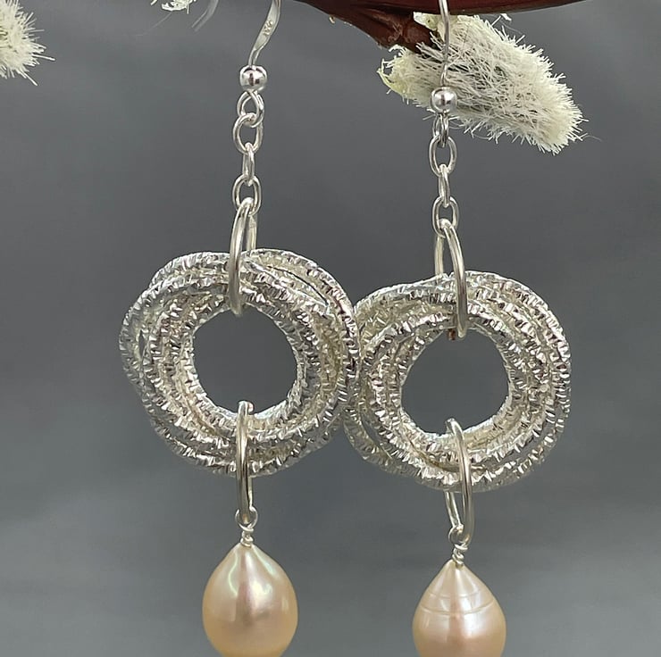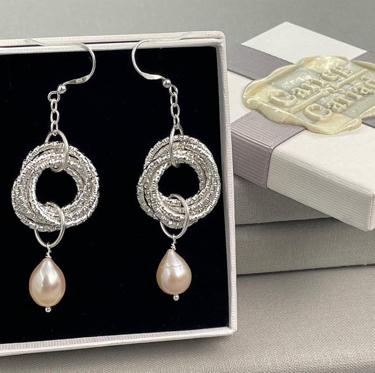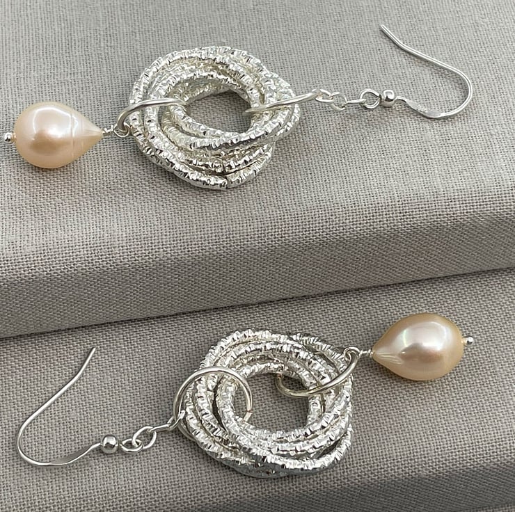 A lovely and dainty pair of earrings featuring a diamond cut Möbius rings with a cultured Pearl drop. Möbius rings are the same as the Russian wedding rings which I made by hammering aluminium wire to a ring mandrel to keep its shape.
