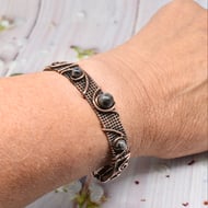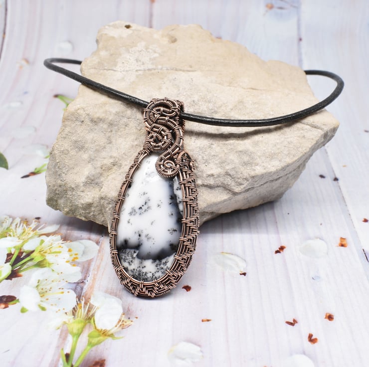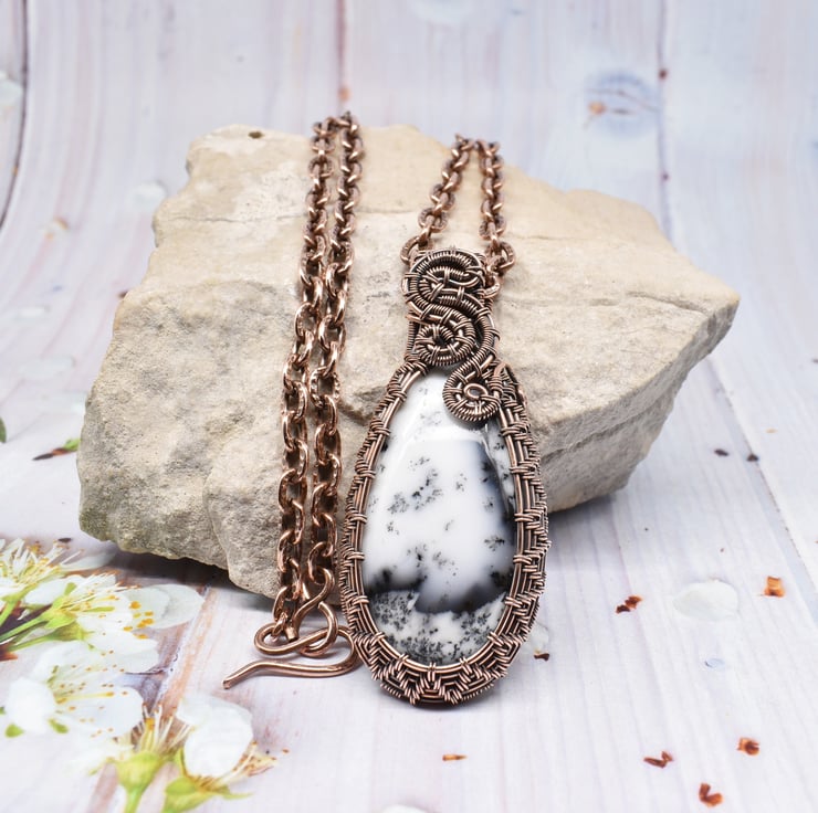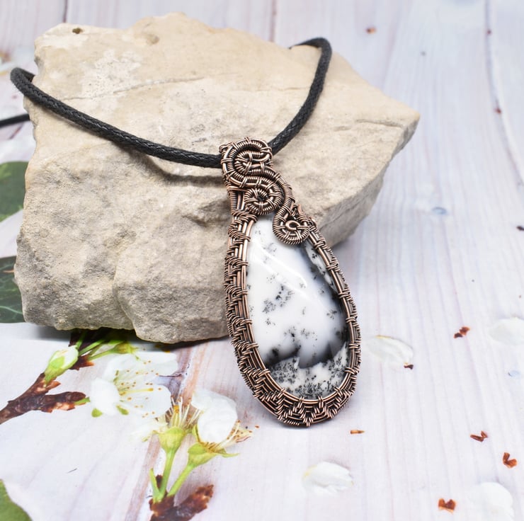This striking pendant is made entirely by hand using weaving and wrapping techniques around this stunning Merlinite (also known as dendritic agate or dendritic opal) using solid copper wire.