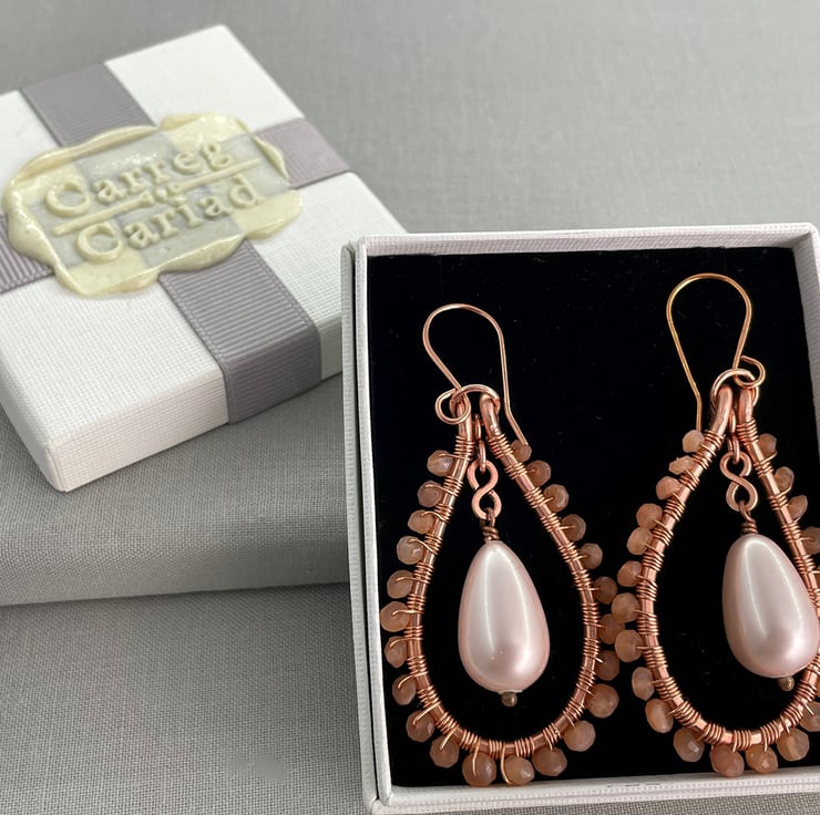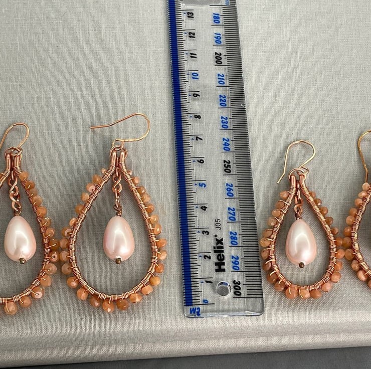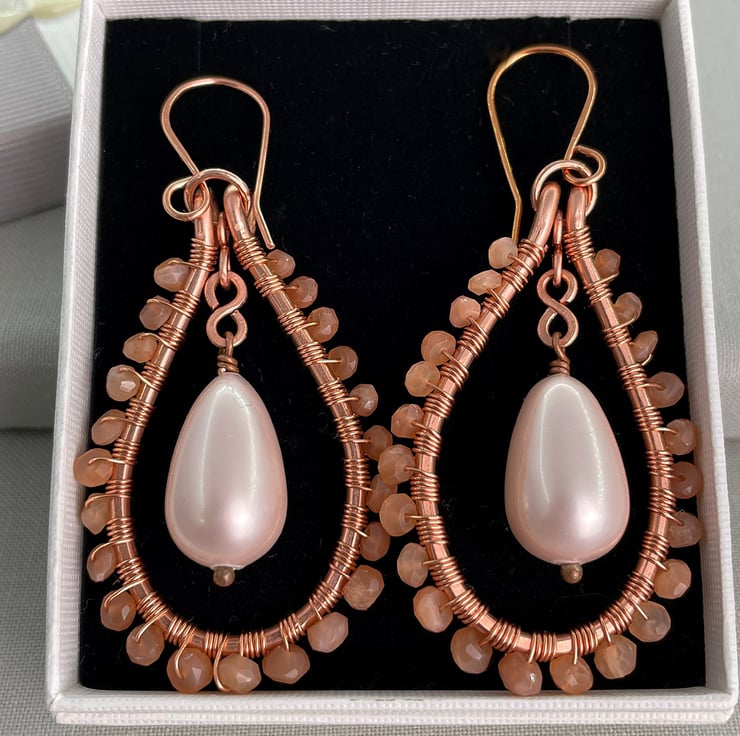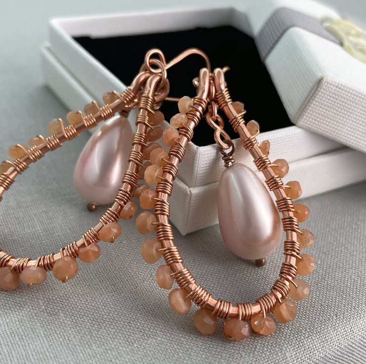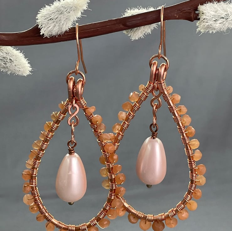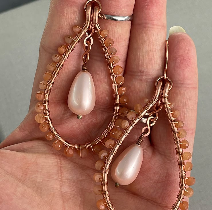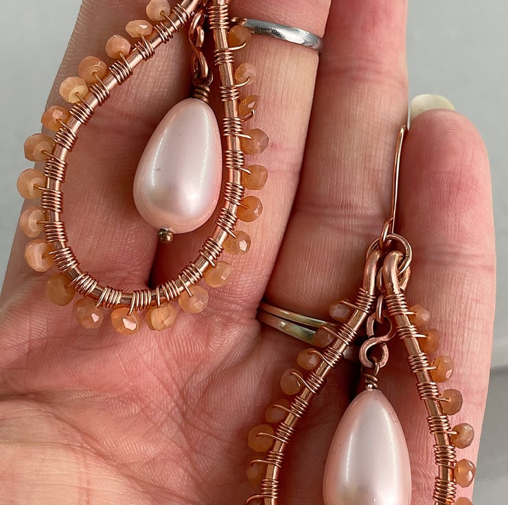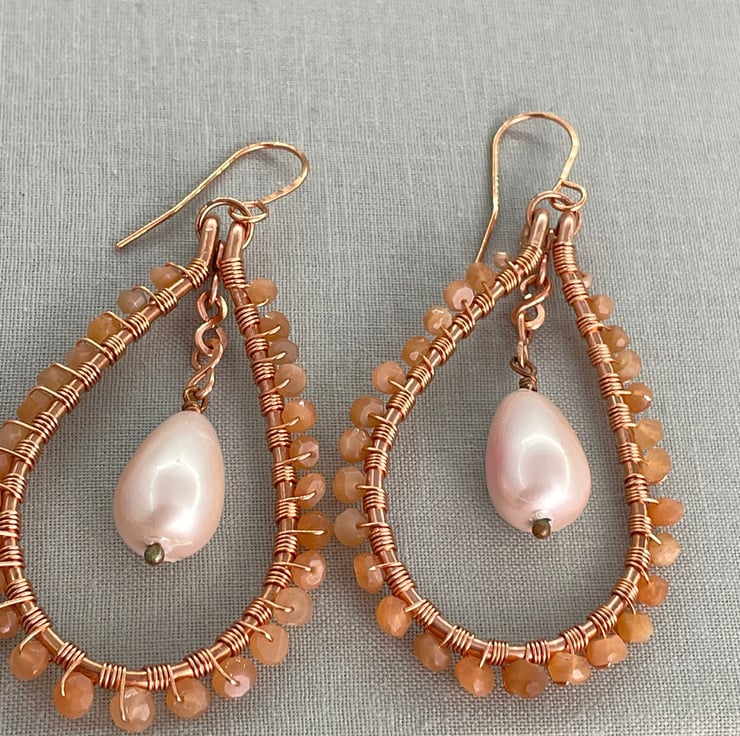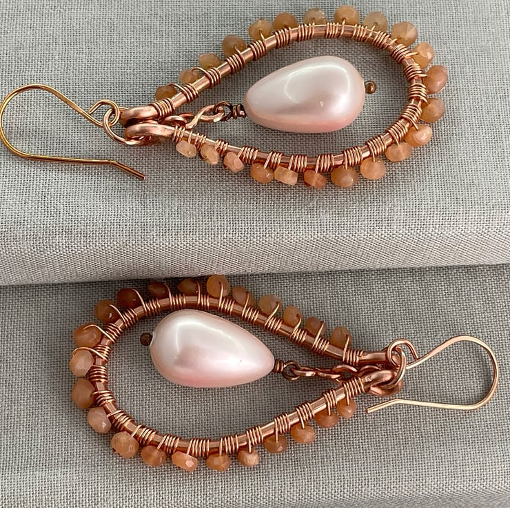 A pair of teardrop earrings featuring sunstone and a shell pearl drop with copper wire.