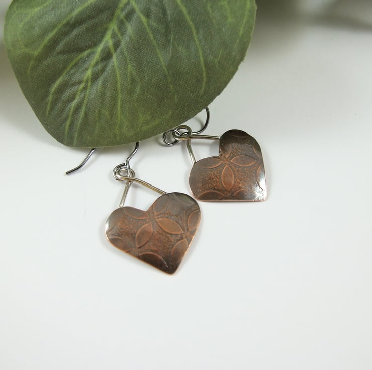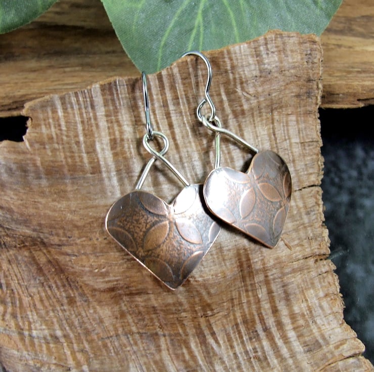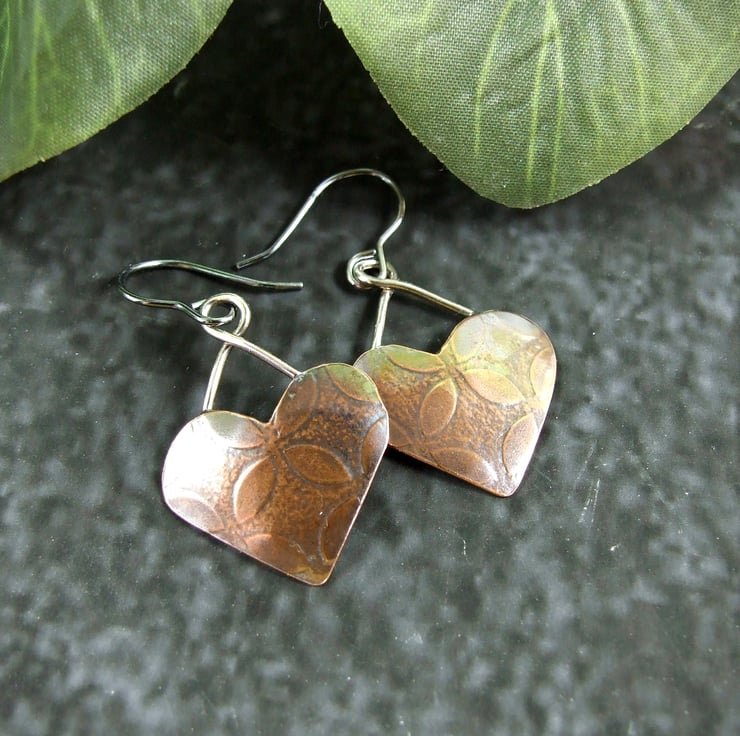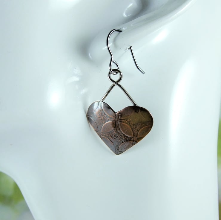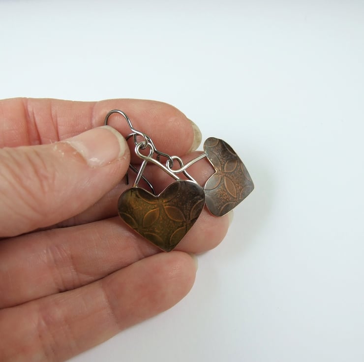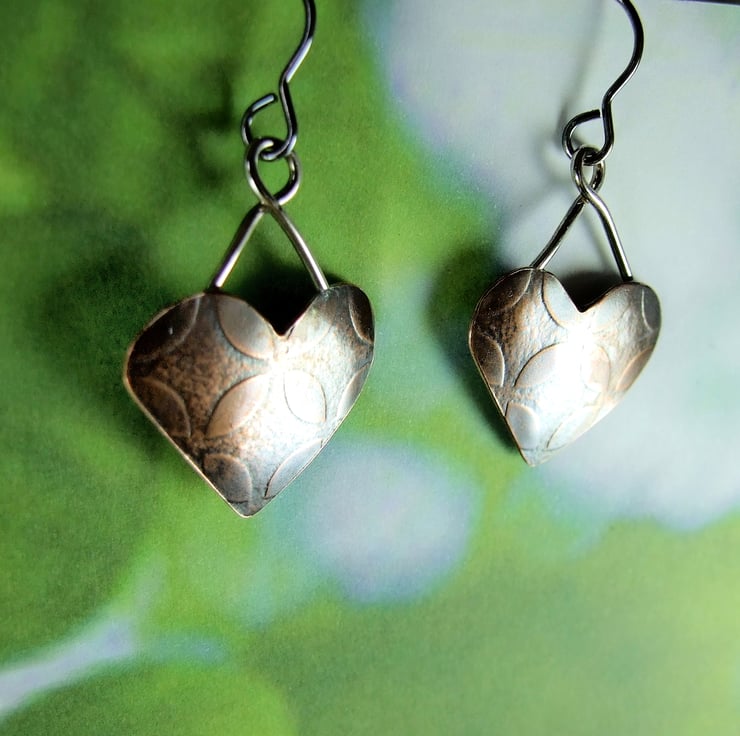 I have created the heart shapes from copper sheet, hand cut and textured with a pattern. I then slightly domed the hearts and then soldered on the shaped silver wire and added ear hooks. The earrings have been given an oxidised finish and polished.