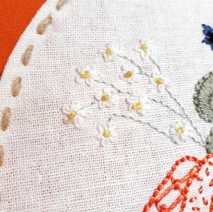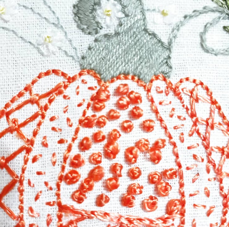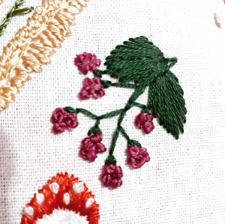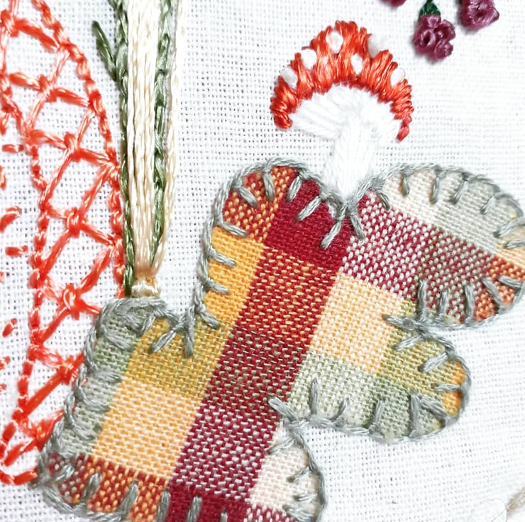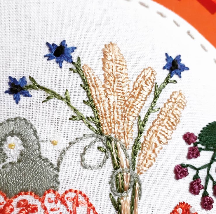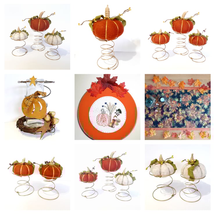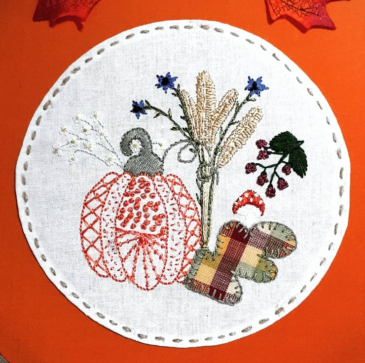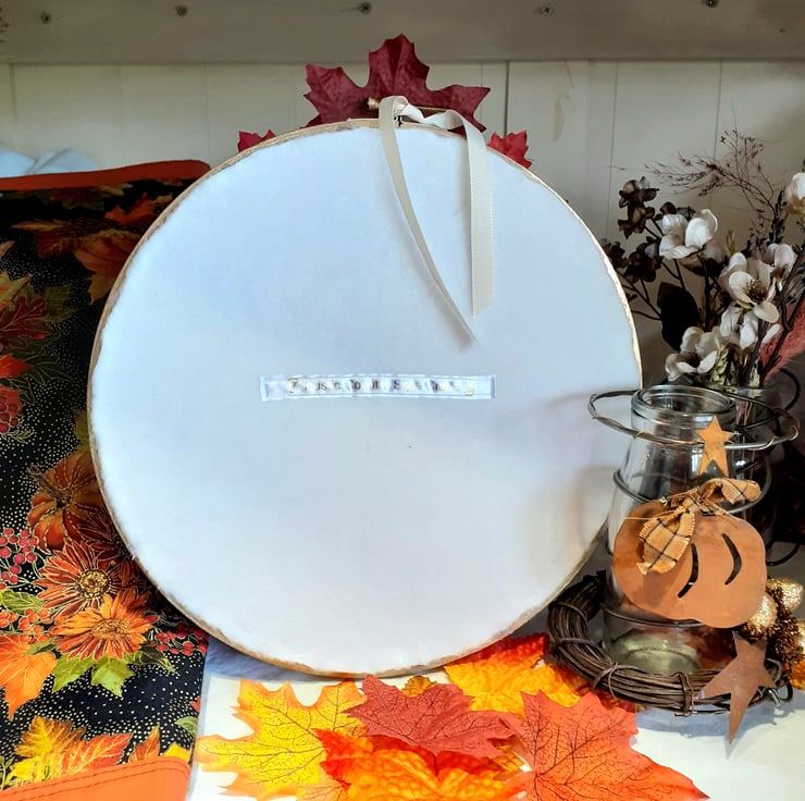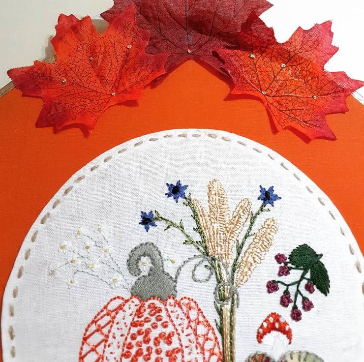 My own design hand embroidered on to linen fabric using DMC embroidery threads and finished off with russet coloured leaves with a length of cotton ribbon at the back which you can tie off to let you tie-off to the exact length for where you hang this gorgeous Autumn Pumpkin Hoop. I've used a lot of French knots to create the pumpkin and then added in other embroidery stitches for the hedgerow wild flowers & brambles, Homespun leaf, barley and of course there had to be a mushroom! Using twine I then hand stitched onto orange cotton fabric and at the top I finished it off with beautiful Autumn leaves which are attached into place, again using French knots. This another of my one-off creations.