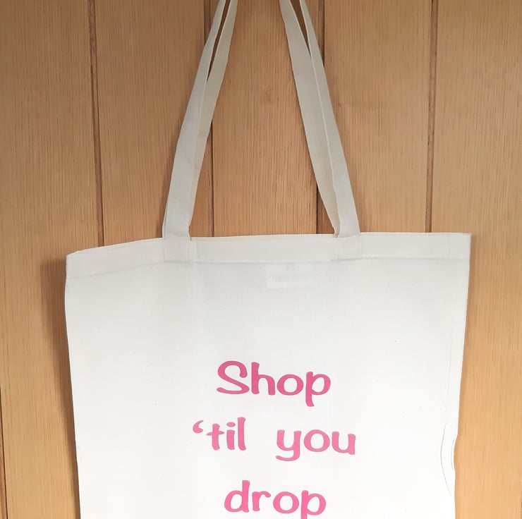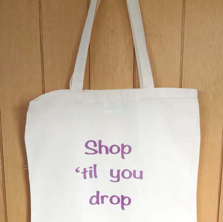 'Shop 'til you drop' cotton tote bag. Approximate size 16in x 15in - handle 12in.