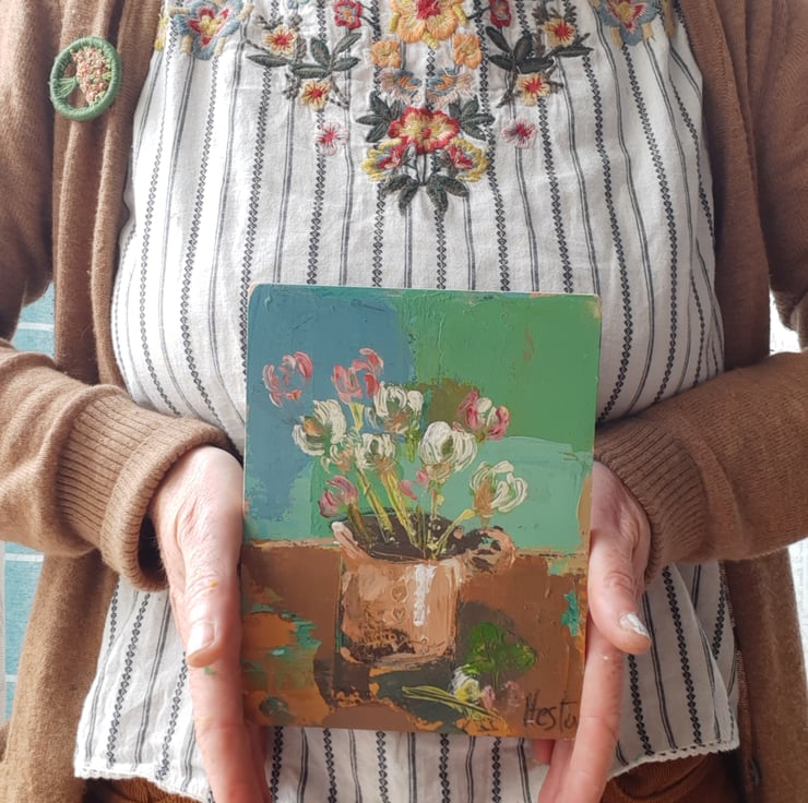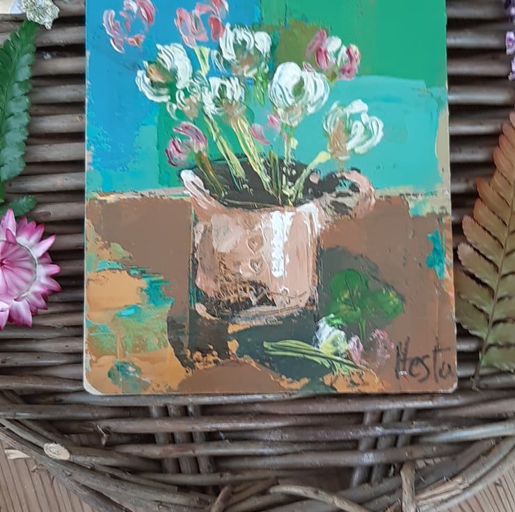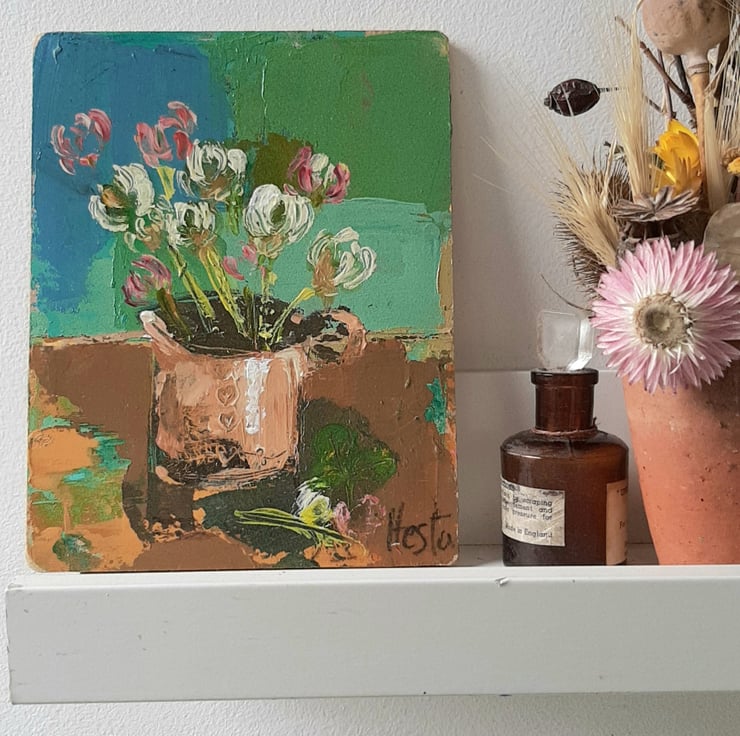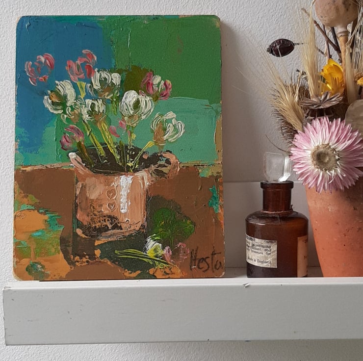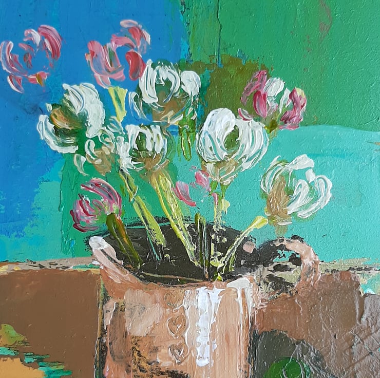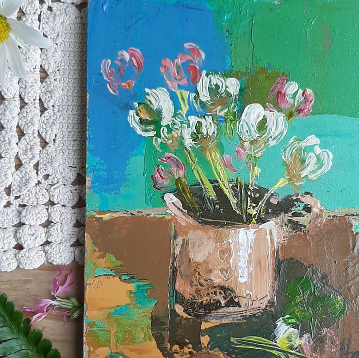 Pink and cream clover in a jug, a contemporary still life by artist hesta singlewood. Original textured painting on board. Measuring 17 cm tall and 13 cm wide. I can frame if you wish for an extra cost. Moden, contemporary small painting.