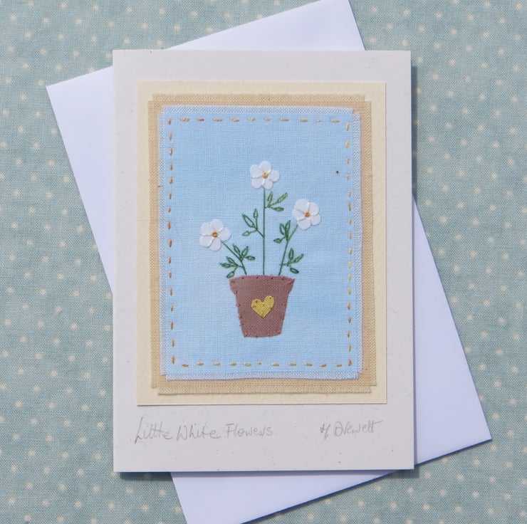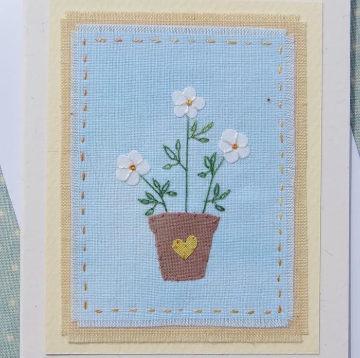 This is a small handmade greeting card featuring a miniature applique pot and flowers with the addition of hand embroidered stems and leaves. Worked on a piece of my hand-dyed recycled cotton, a card to keep, suitable for almost any occasion!