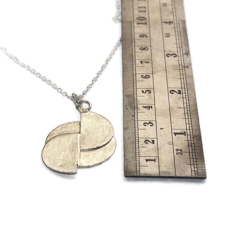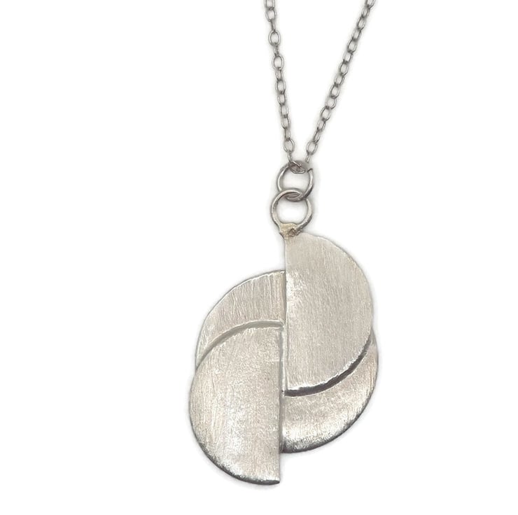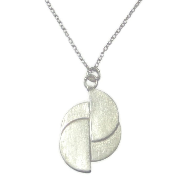 This striking pendant features two semi circles on a circle base creating an unusual shape, modern with an Art Deco feel