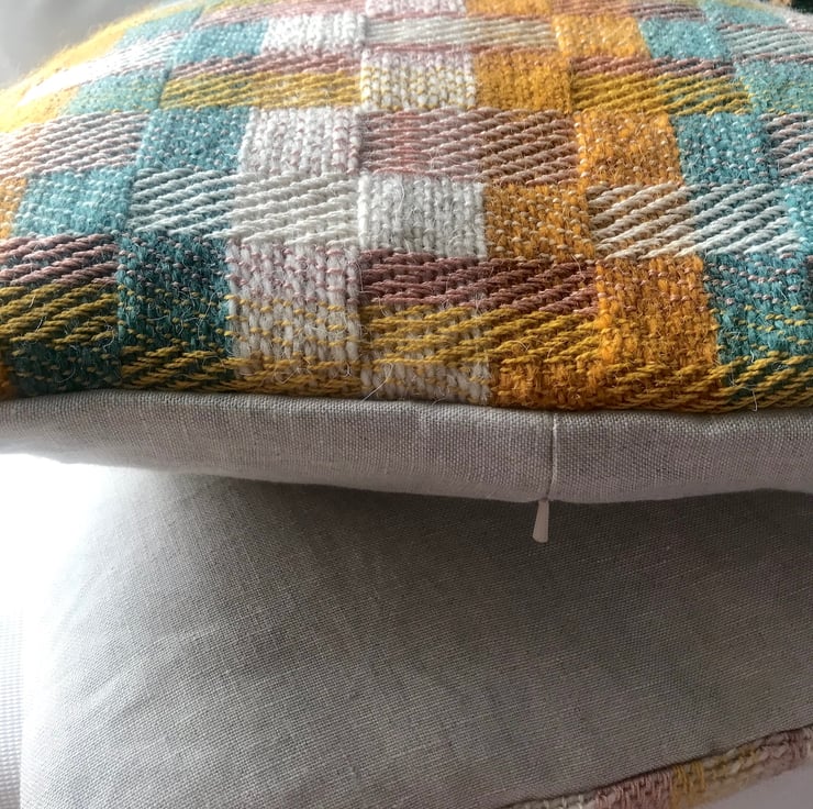 Sustainably handwoven using wool rug yarn and premium OEKO standard cotton yarns, which were available yarns in my studio leftover from previous collections and projects. The back panel is a beautiful quality natural linen woven in Scotland.