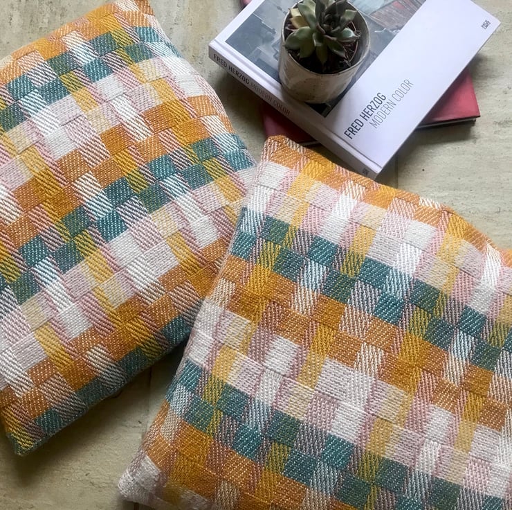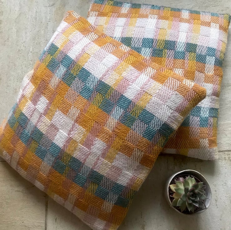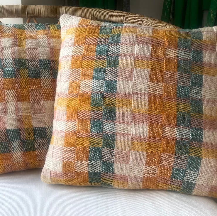 Beautiful limited edition square cushions. Handwoven using a combination of chunky wool yarns and fine lustrous cotton yarns creating a modern design with a lovely texture. The colour palette brings together Jade Green, Nectar Yellow, Snowdrop, and a hint of blush pink.