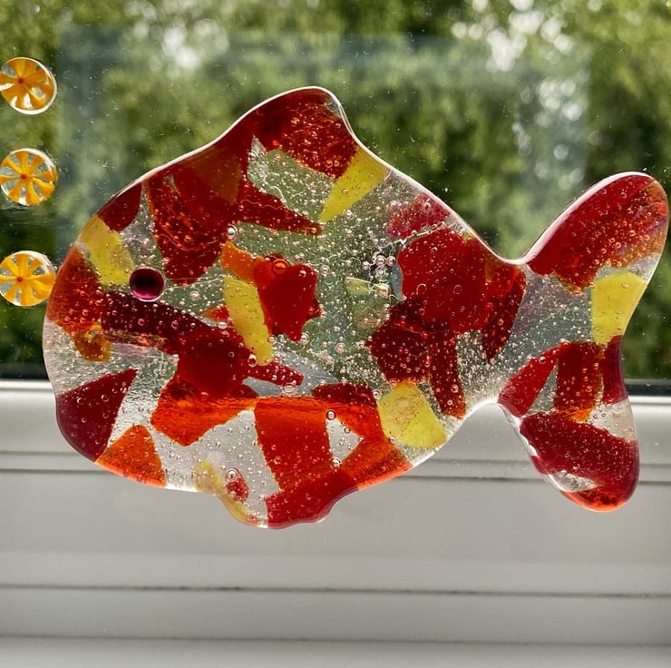 Lovely shades of red, orange and yellow have been used with lots of clear glass and some shimmery dichroic pieces to fill a mould before fusing in a hot kiln for 12 hours. It is then fused a second time to secure the little glass eye. There are also three little orange bubbles.