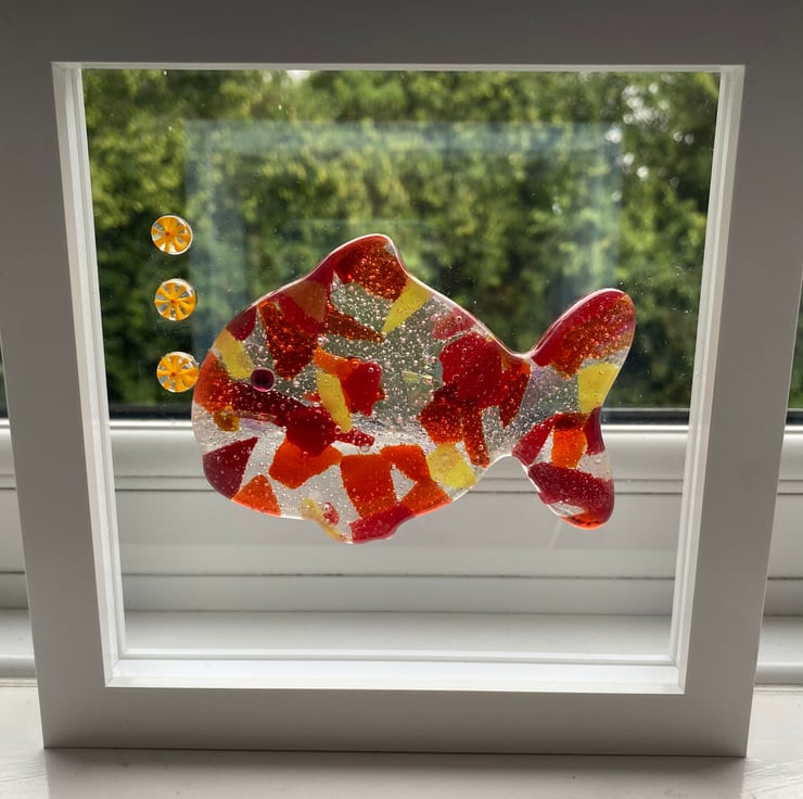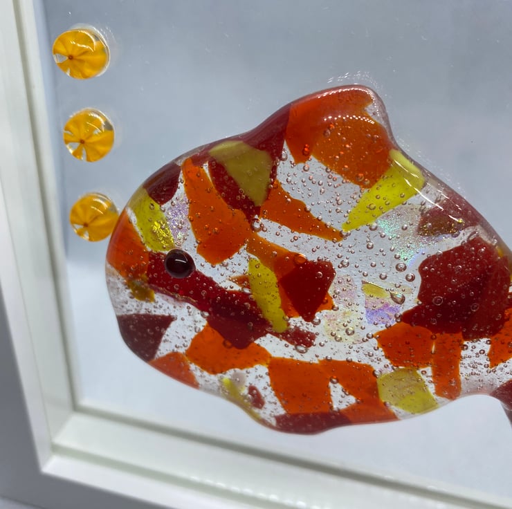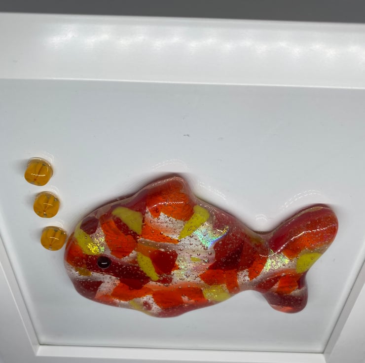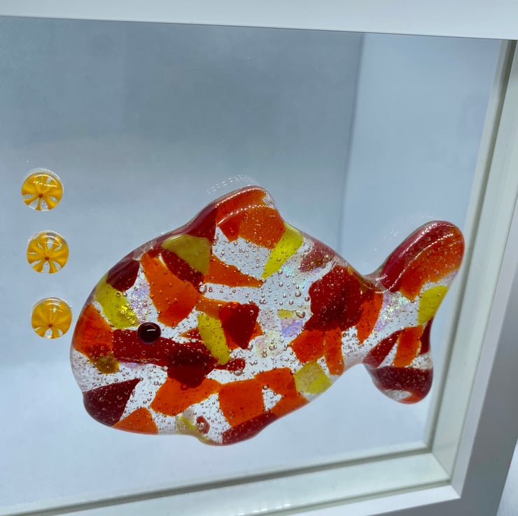 The finished elements are attached to a piece of clear glass which is then fixed to the inside of the white box frame. The fish measures approximately 9.5cm by 7cm and the box frame is 17.5cm by 17.5cm.