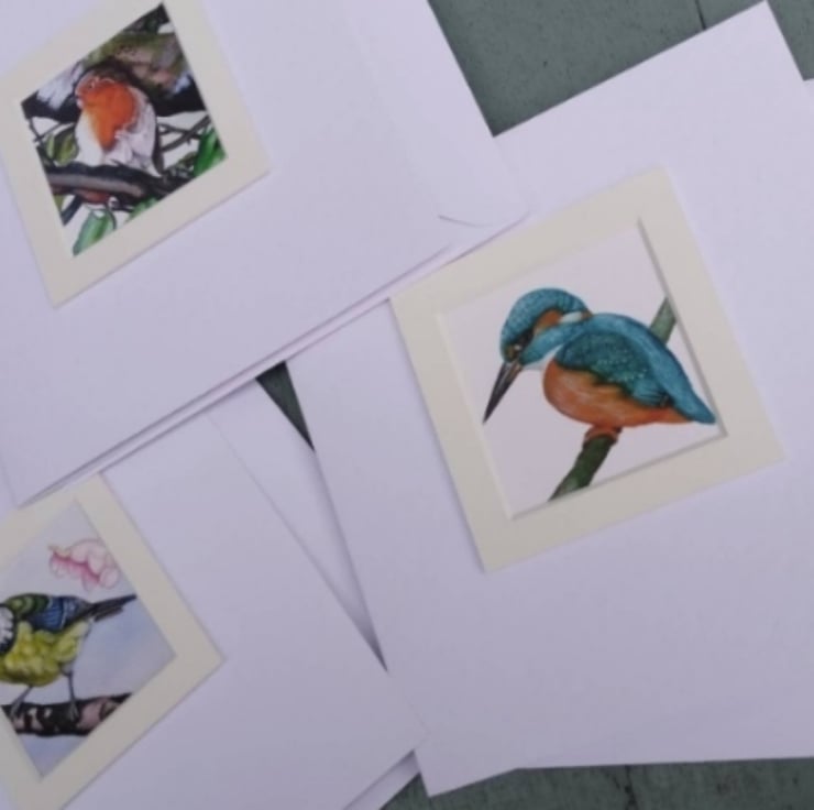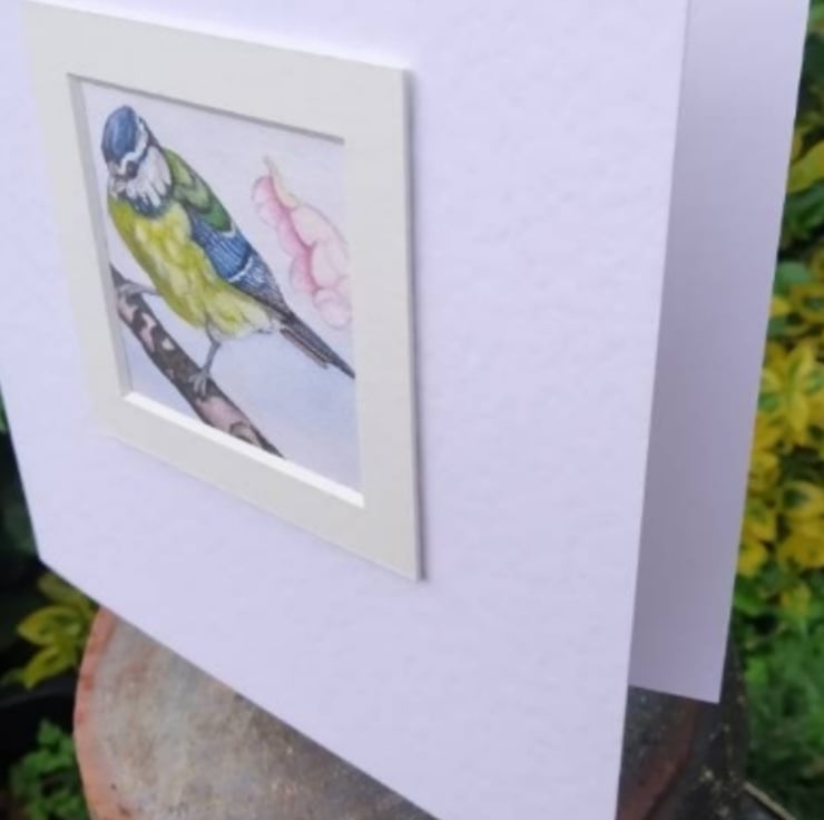 Part of my bird greeting card range. A Blue-tit greeting card made with a miniature print from my original watercolor painting.