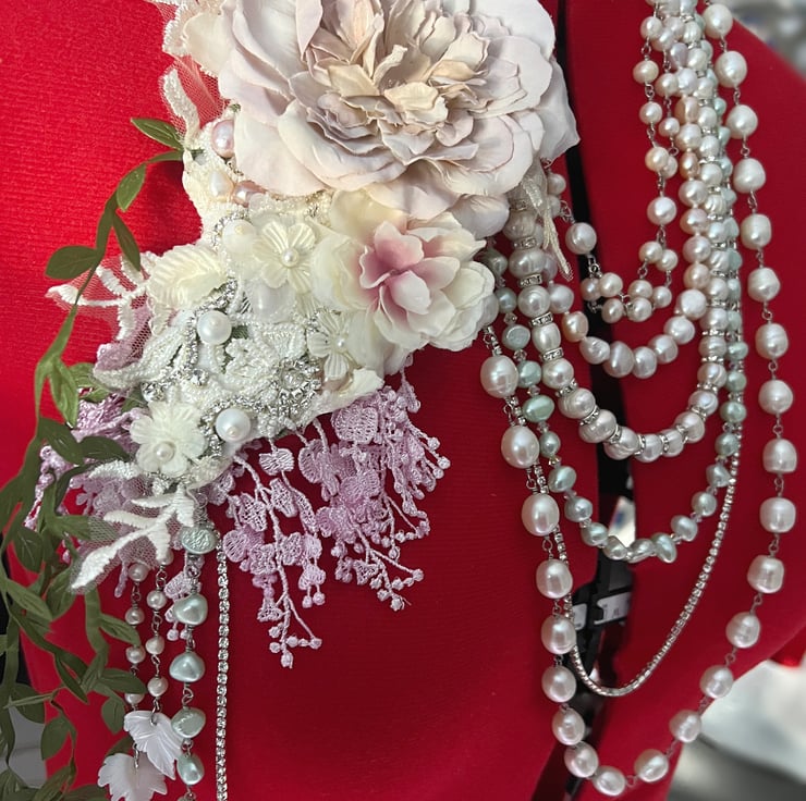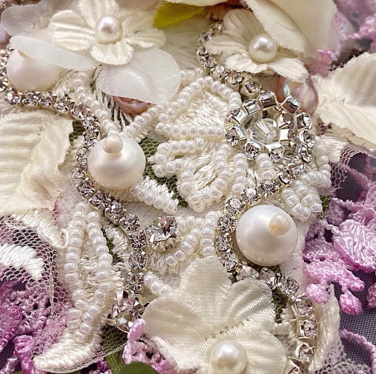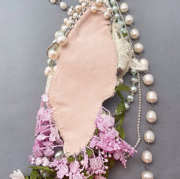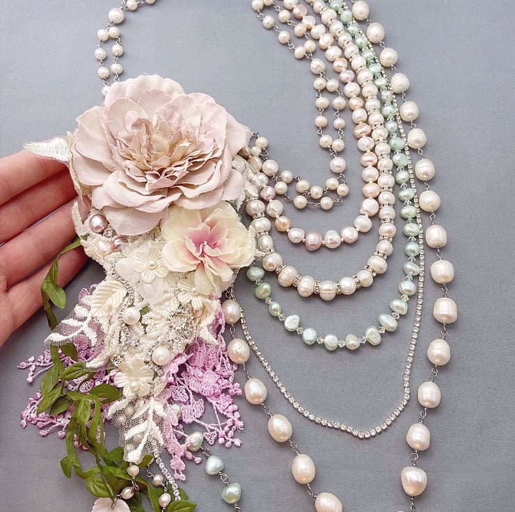 A striking and unbelievably feminine corsage style necklace that’s been hand embroidered intricately to the highest standard using silk flowers, lace, cultured pearls with Swarovski and Austrian crystals.