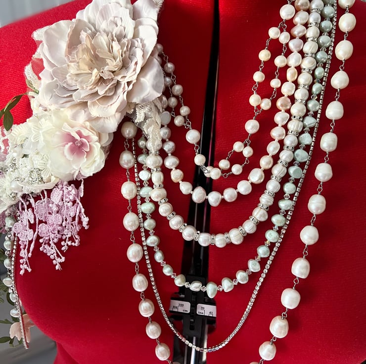 A 6 strand including Swarovski Crystal cup chain, cultured pearls, Swarovski bicones and miyuki seed beads. Please note that the flowers is not detachable and have been carefully stitched onto the panel.