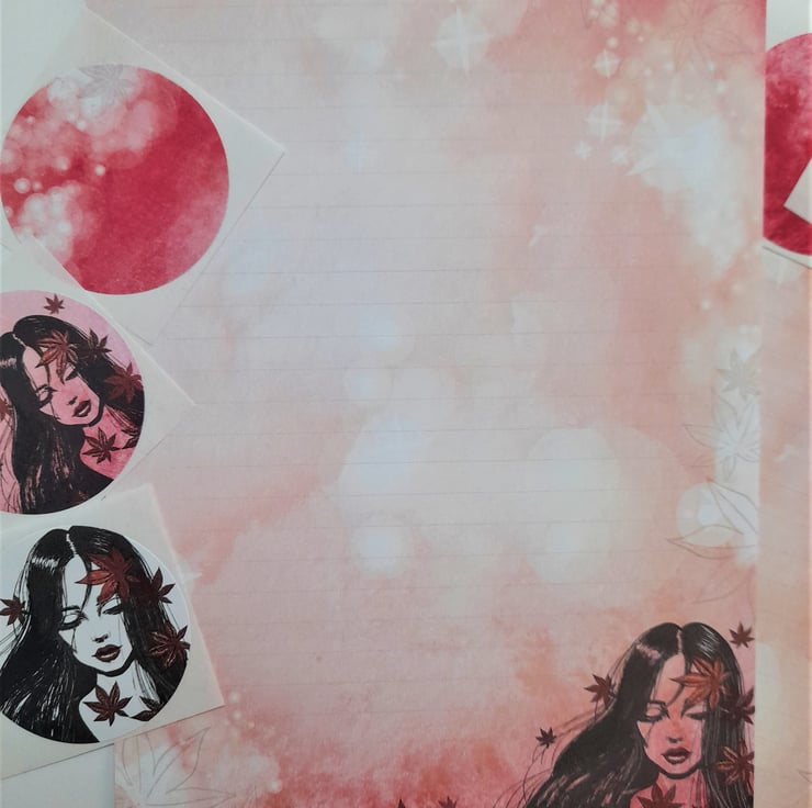 A set of 10 sheets of A5 size handmade letter writing / notepaper set with a red background design, which I have digitally altered and collaged, and a raven haired woman in the foreground. The image on the notepaper has been made feinter to allow for it to be written over without dominating your handwriting.