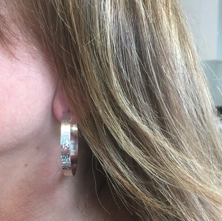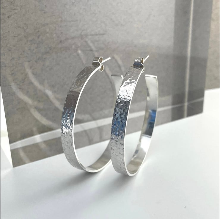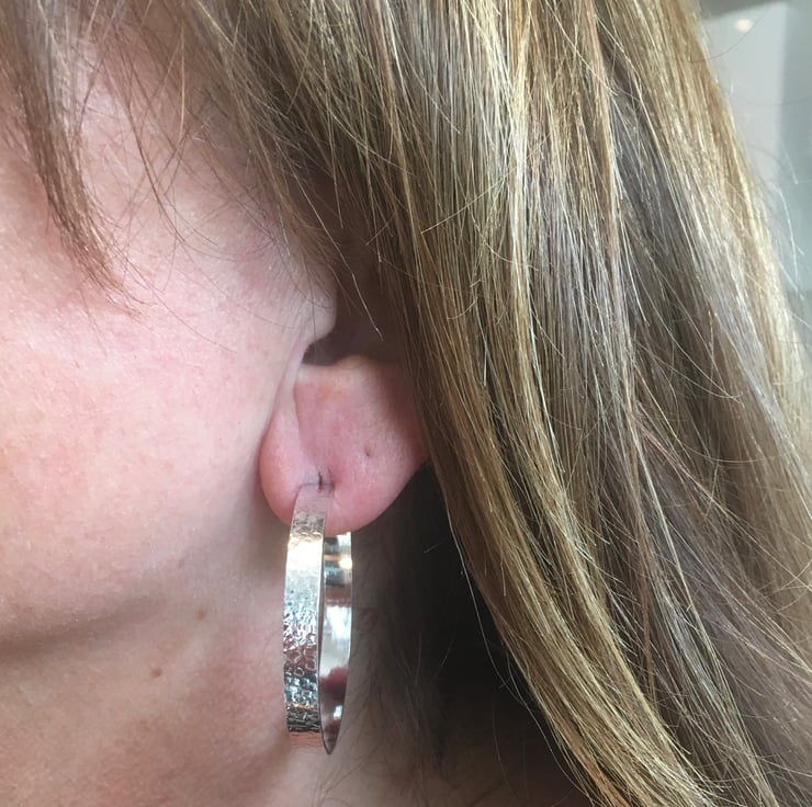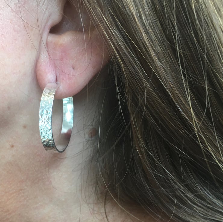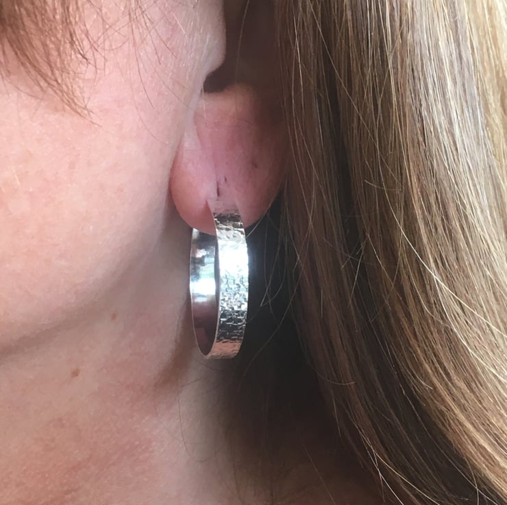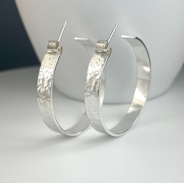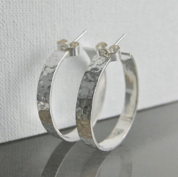A lovely pair of hoop earrings handmade from 925 sterling silver. Cut by hand from solid 1mm thick/5mm wide silver rectangular wire, formed into circular shapes then hammered to create their unique attractive sparkly textured surface. They have long silver pin fittings and secured with stamped (925) silver scroll’s/butterfly’s