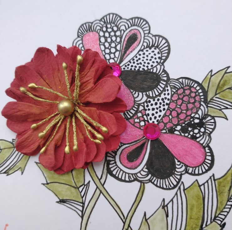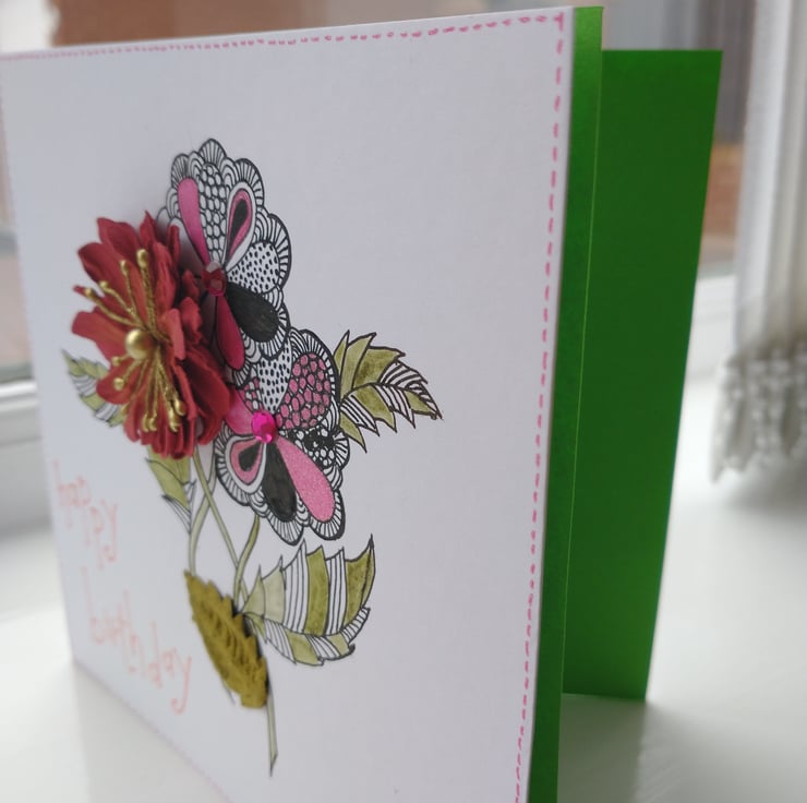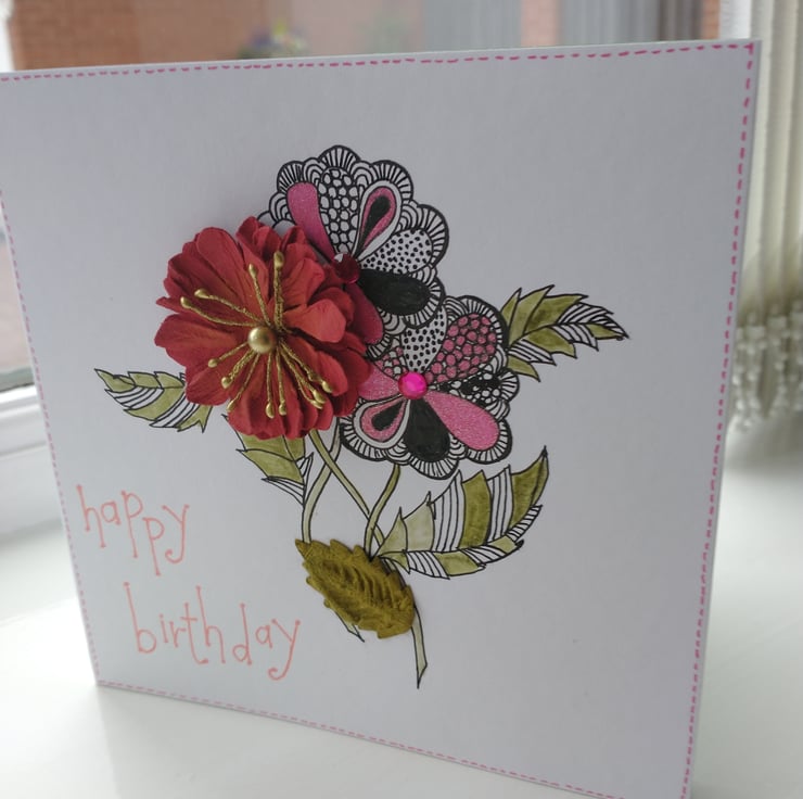 A completely handmade and uniquely designed card. Consisting of a beautiful spray of flowers hand drawn and coloured. Including a paper made one. Drawn onto quality pristine white card. Embellished with pink beads. Finished off with hand written happy birthday