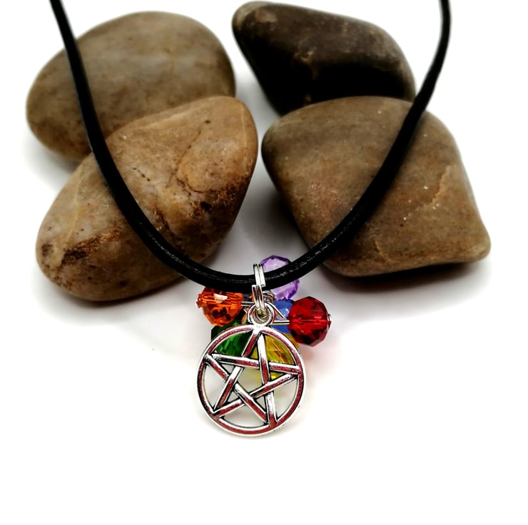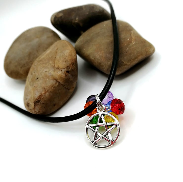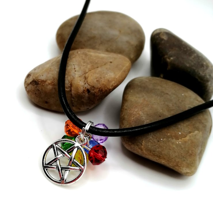 This pretty necklace is perfect for everyday wear. The beads are all cut glass. The pentacle is silver plated. Please leave me a message with your choice of necklace length and type. I am able to offer black or brown leather or silver plated chain, in any length. If I don't receive a message I will send a 18 inch black leather necklace.