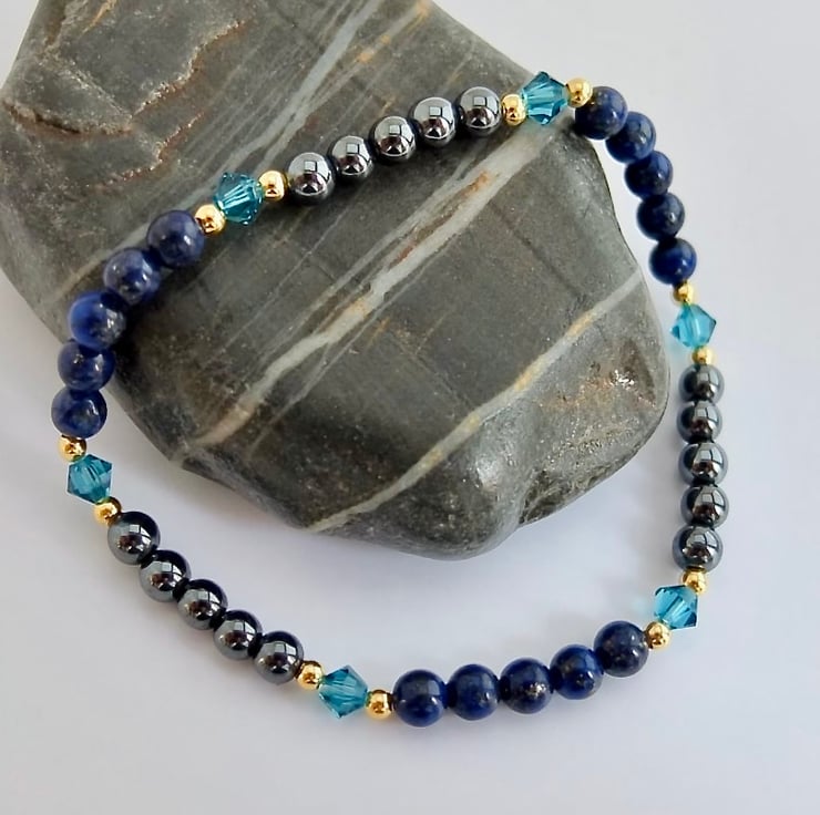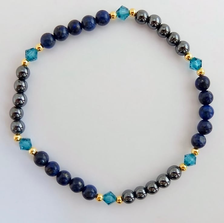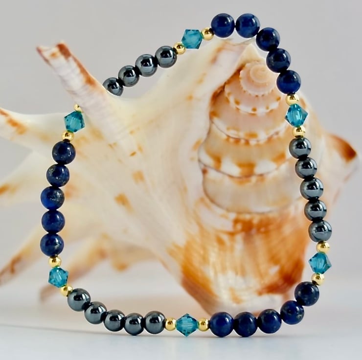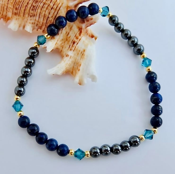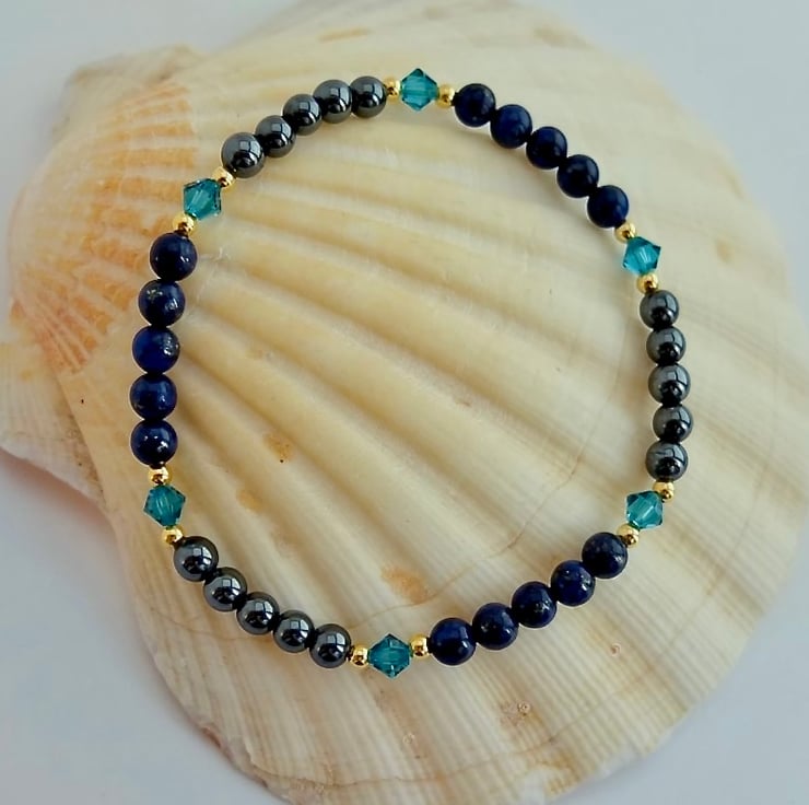 Delicate, sparkly bracelet of 4mm lapis lazuli and hematite beads separated by quality Austrian crystals in a colour called 'indicolite'.