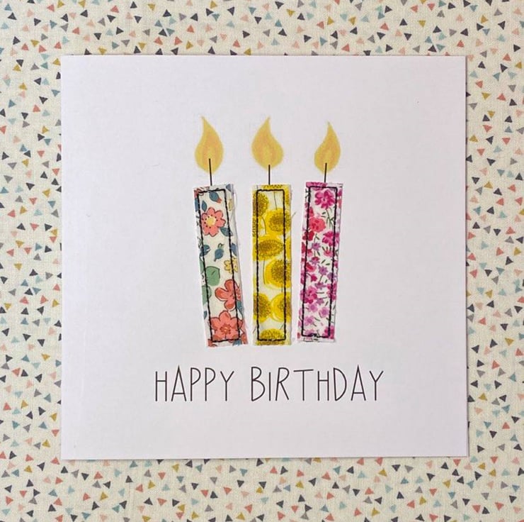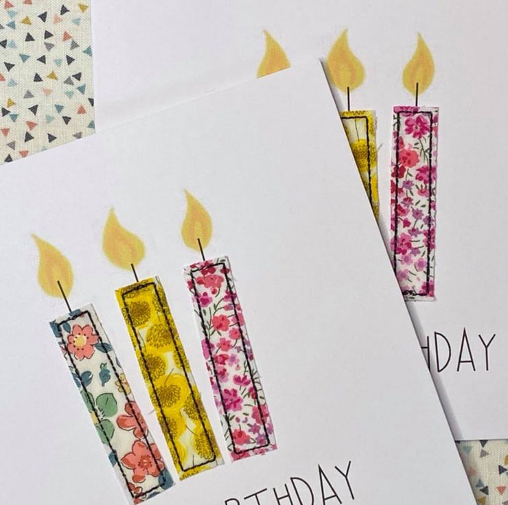 This is a HAPPY BIRTHDAY textile card made using Liberty fabric candles which are mounted on a White 300gm card.