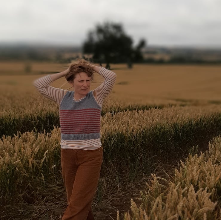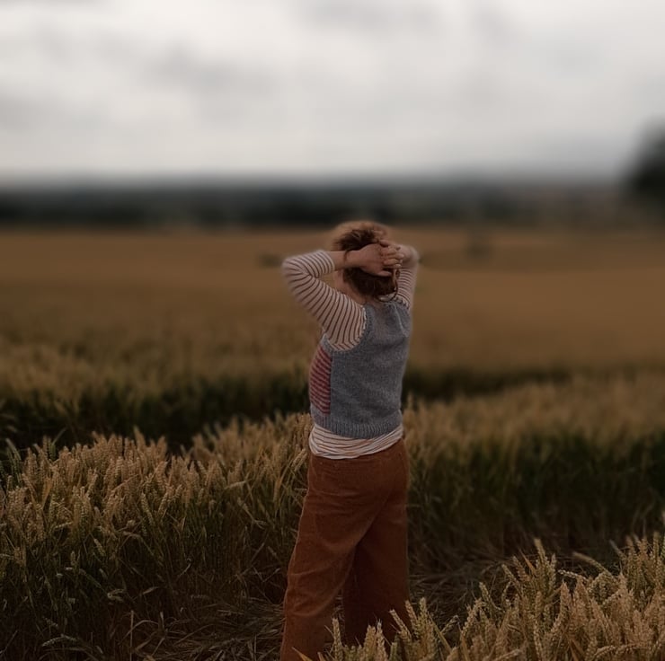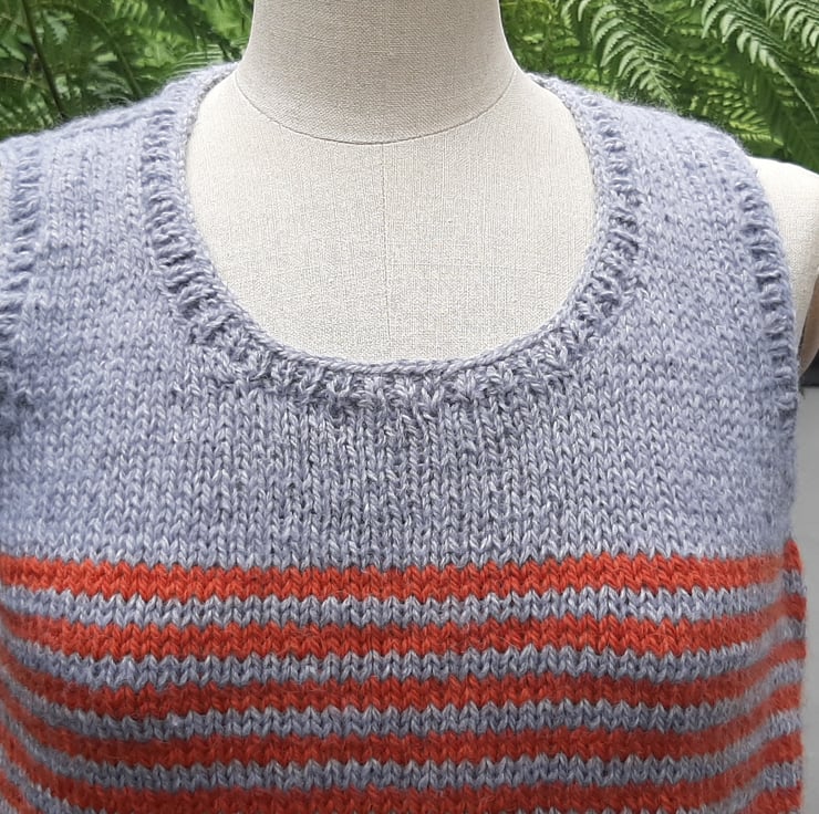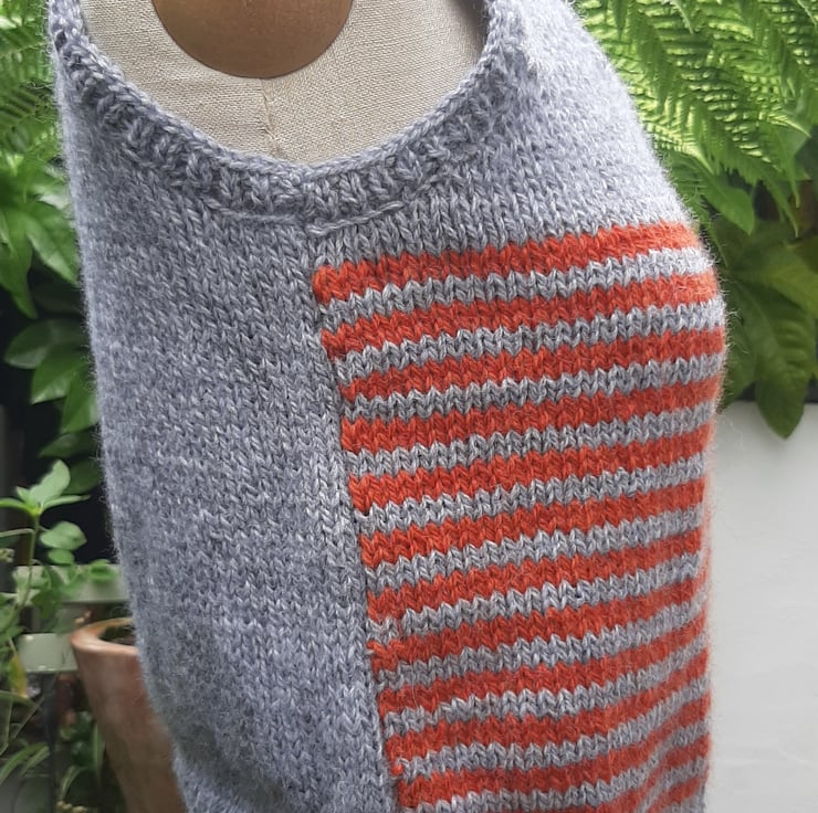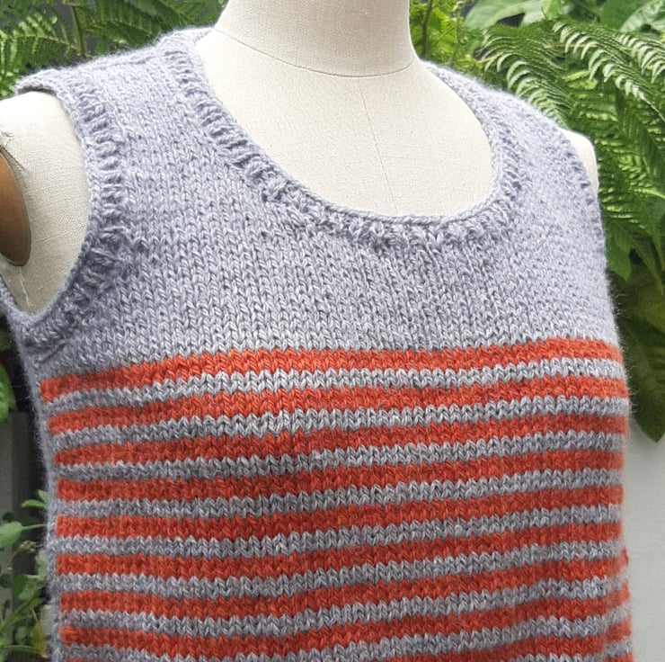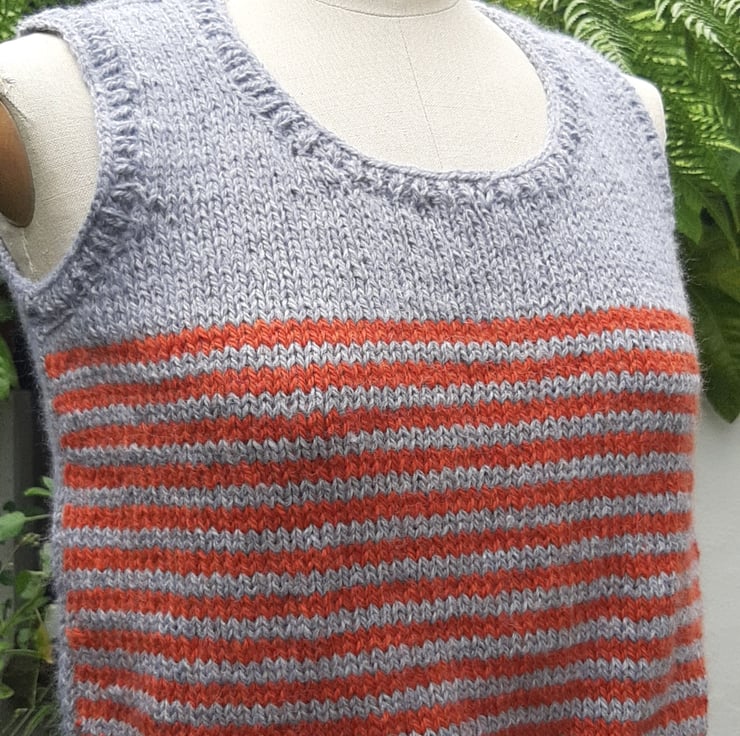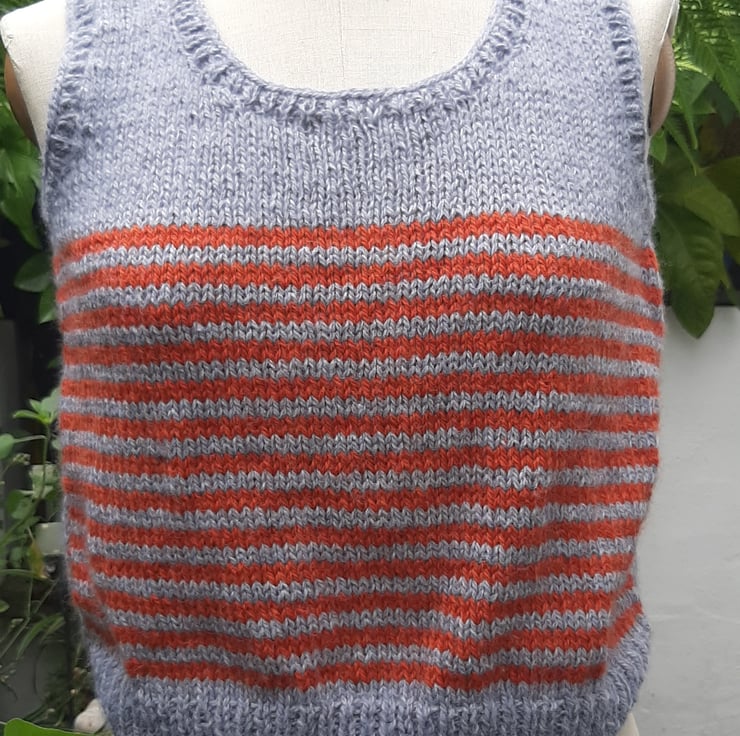 In a very soft grey and burnt orange wool. An original one off cute tank top knitted in Rutland by my beautiful mum who is a very neat knitter. Measuring 42 cm cross the body. 45 cm.tall . Medium
