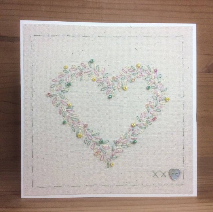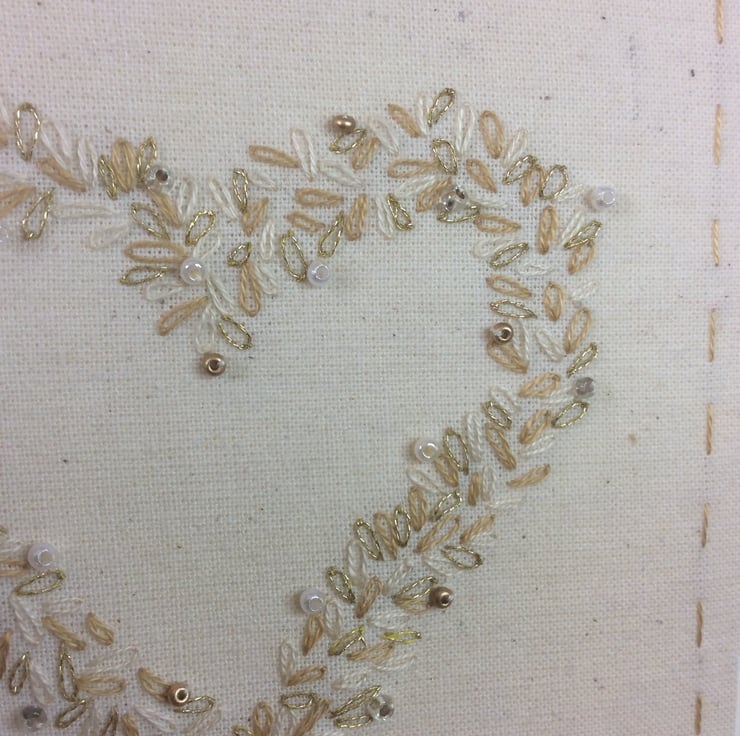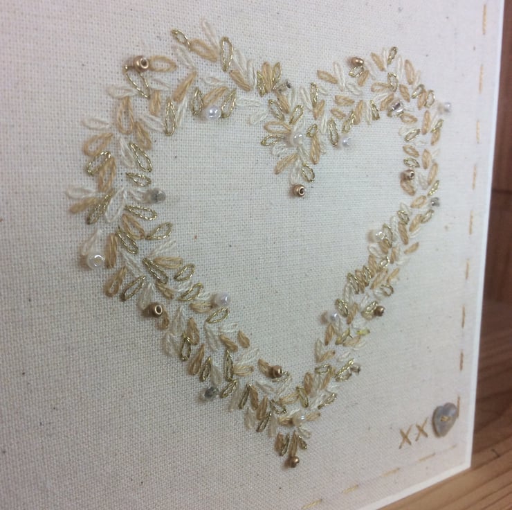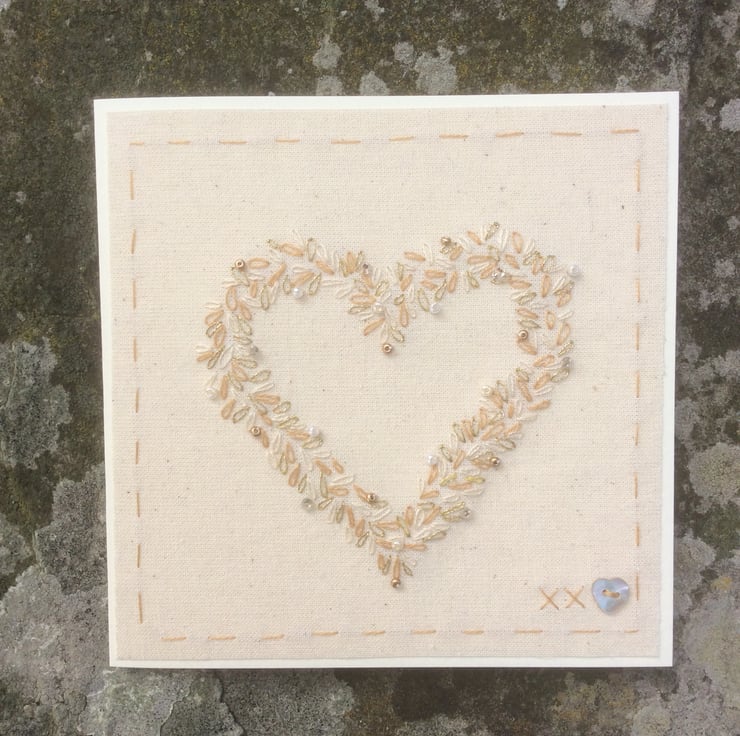 A beautifully made one of a kind keepsake card, hand stitched with cream and gold thread and embellished with tiny matching seed beads, this card would be perfect to send for a Wedding Day or a Golden Wedding Anniversary. It is stitched onto a calico background and backed onto cream card, with matching envelope. All of my cards are one of kind and make a lasting gift and can easily be framed by the recipient. It measures 12.5 x 12.5cm and comes carefully packaged in tissue paper and sent within one day of purchase. This card will be made to order so may vary very slightly to the photos as all of my cards are hand embroidered by myself.