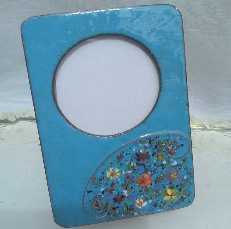 This lovely photo frame measures 50mm x 70mm. It is made from 1.2mm pure copper and I have enamelled the front , approximately 5 times firing to 800 degrees C. I have added glass flowers,which I have fired fusing into the molten enamel. I have also added sterling silver wire around the flowers.