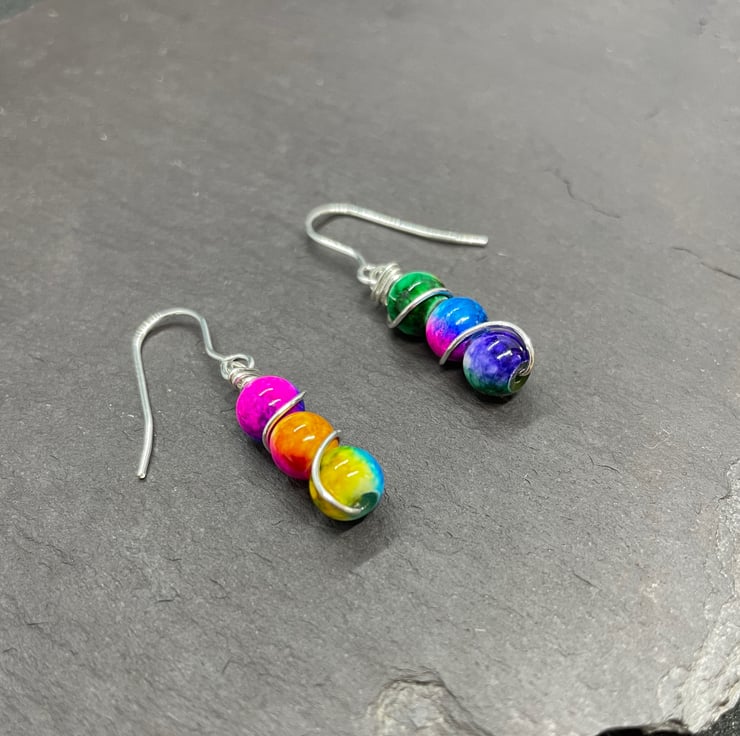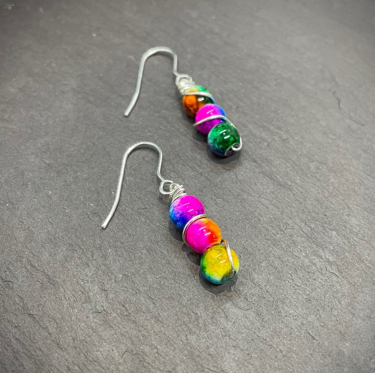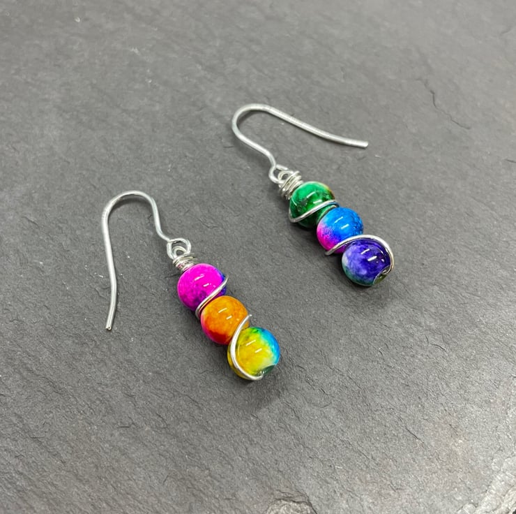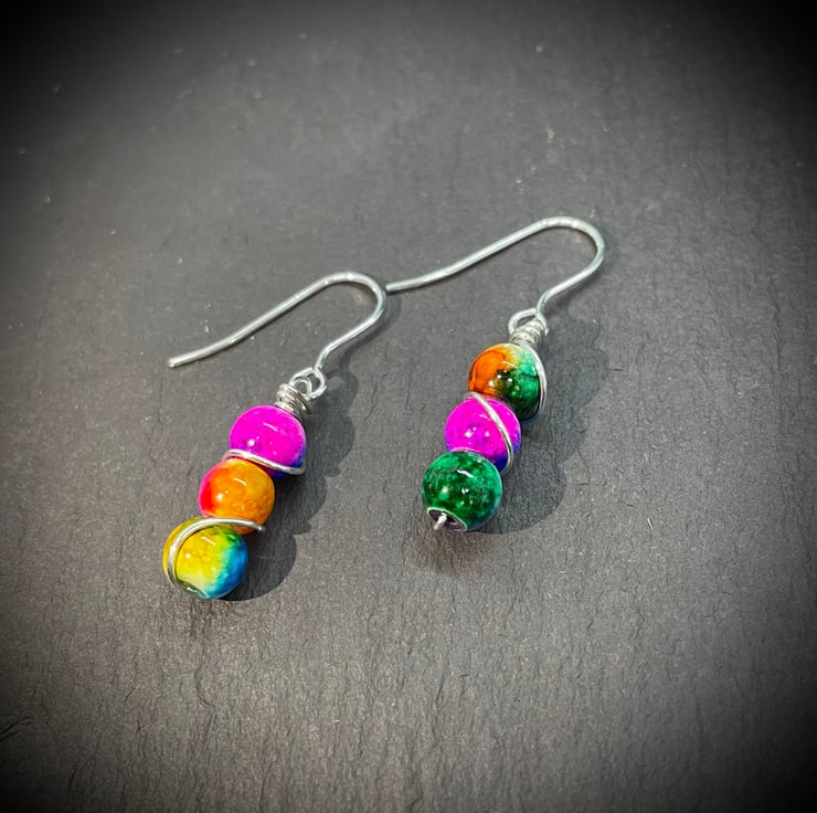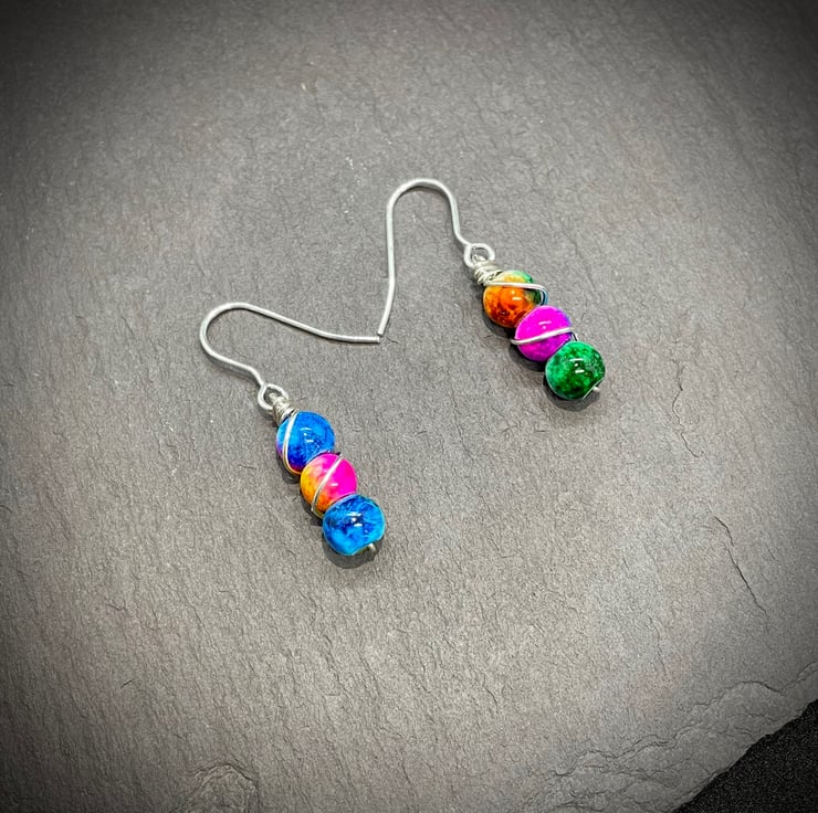 This custom listing for SN is for the 3 bead cosmic swirl earrings. These earrings are part of my Cosmic Swirl collection & are fully handmade from silver plated wire with 3 gorgeous bright galaxy coloured glass beads per earring & a single swirl of wire. The ear hooks are sterling silver.