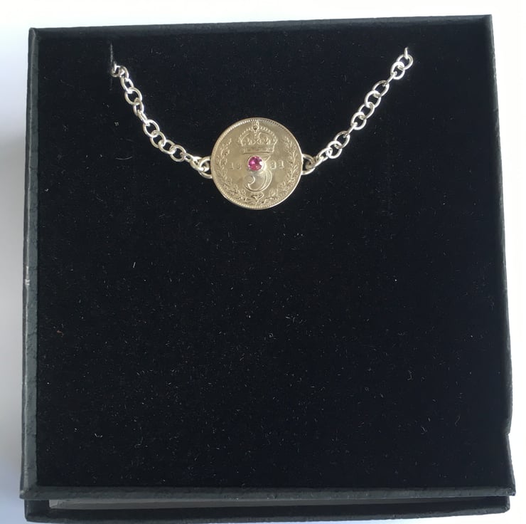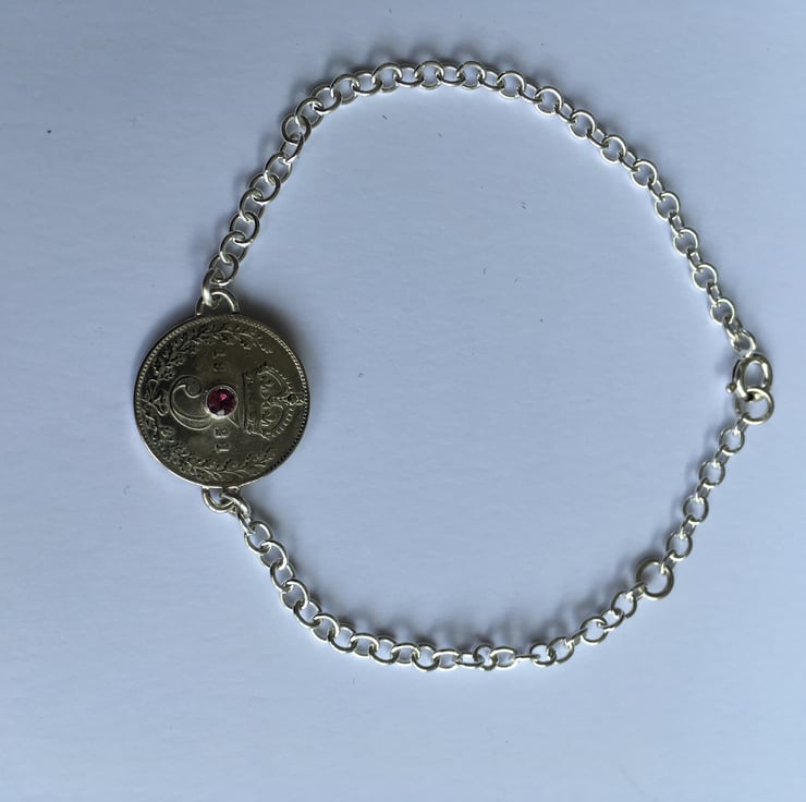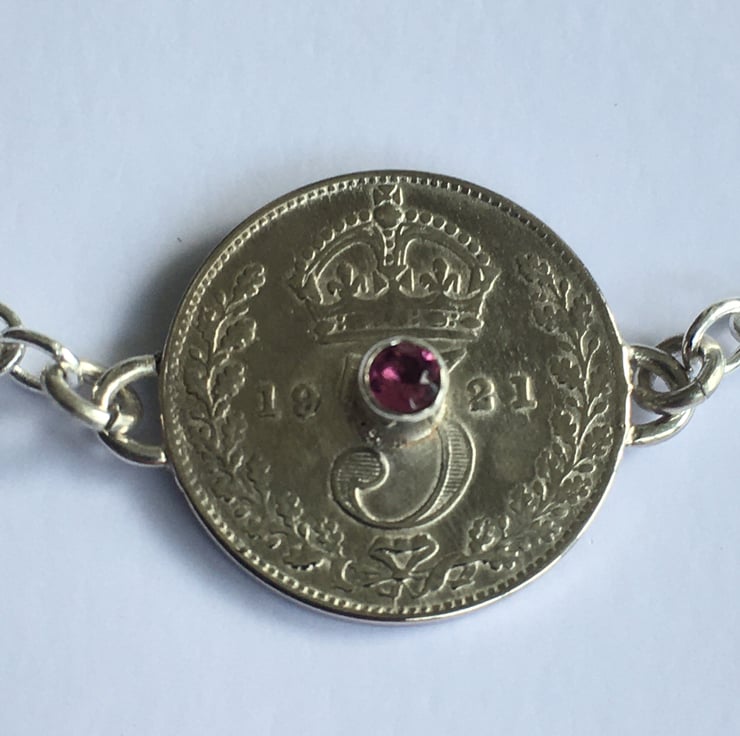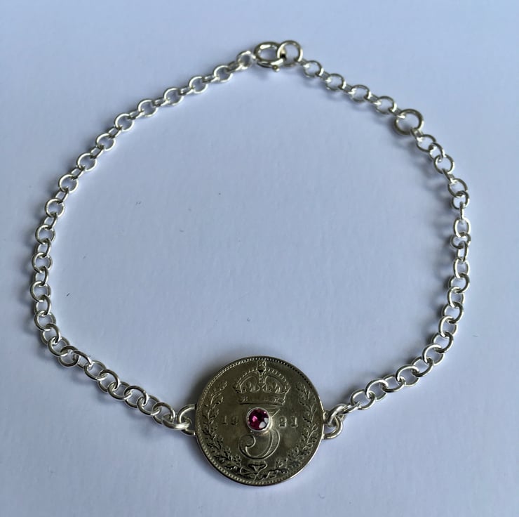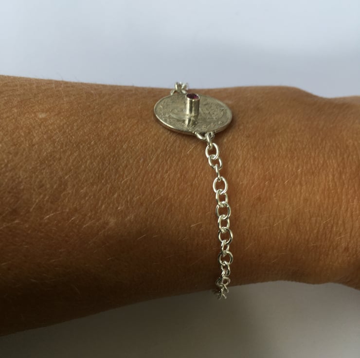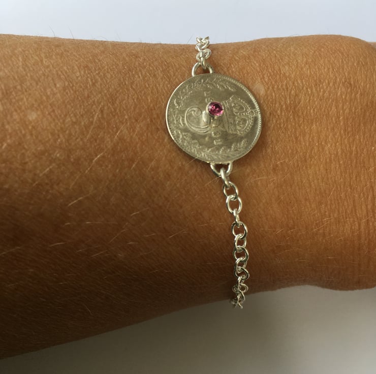 This pretty bracelet has been made using a beautiful fine silver Threepence which has been hand set with a vibrant 2.5 mm faceted Pink Tourmaline . The substantial Sterling silver chain is a 3mm Trace chain, it has two options for length and can be connected at approx 17 or 19 cm.