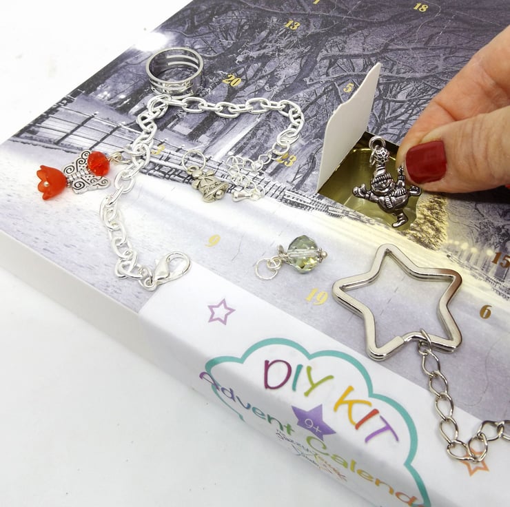 Rather than chocolates, each window of this luxurious Christmas calendar contains a variety of Christmas themed charms, beaded dangles, findings and instructions so you can build up your charm bracelet and keychain by Christmas Day.