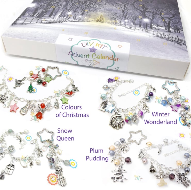 There are four colour scheme to choose from: Colours of Christmas, Winter Wonderland, Snow Queen and Plum Pudding (images for reference only: beads and charm selection will vary in each box)