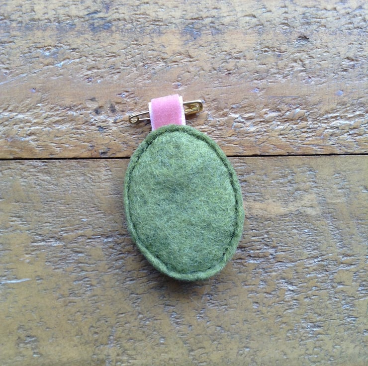 I have embellished a piece of Liberty fabric with crochet lace, an antique gold effect metal butterfly bead and a hand embroidered rose. This is then wrapped around a felt padded cabochon and machine stitched to some felt. The felt backing is hand stitched in place. The brooch is hung from a velvet ribbon and gold coloured metal pin.