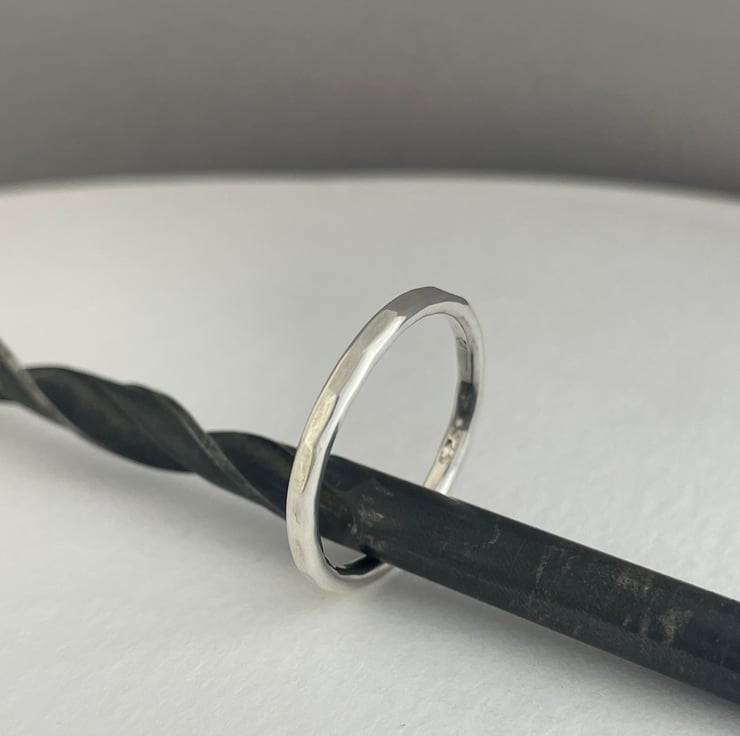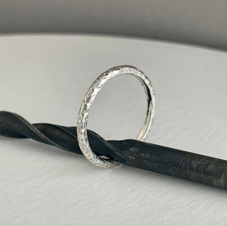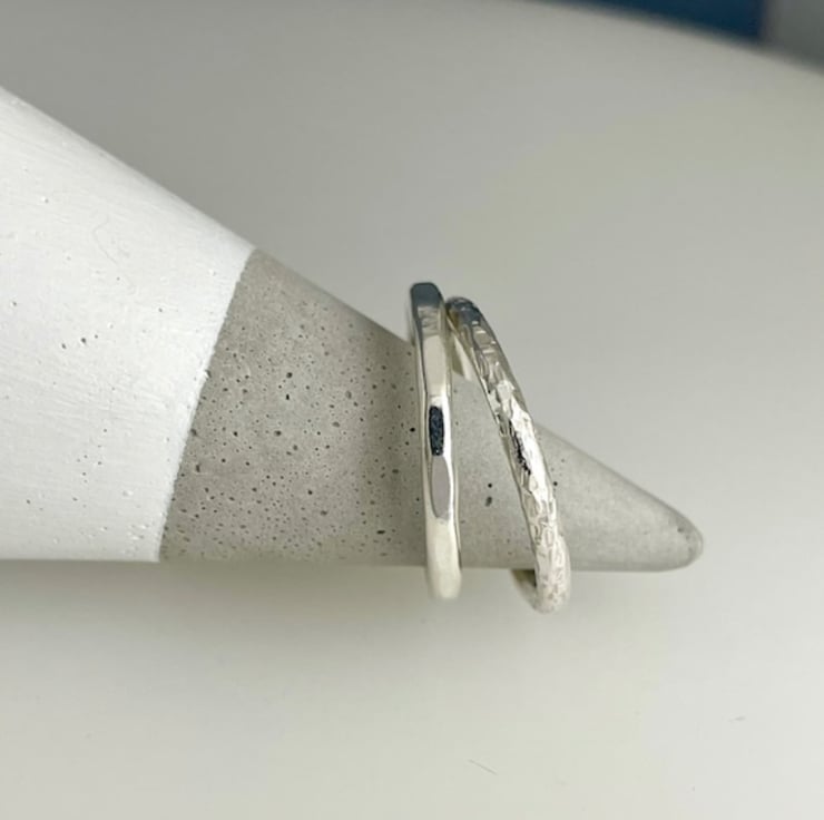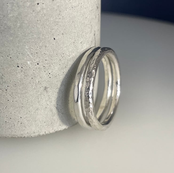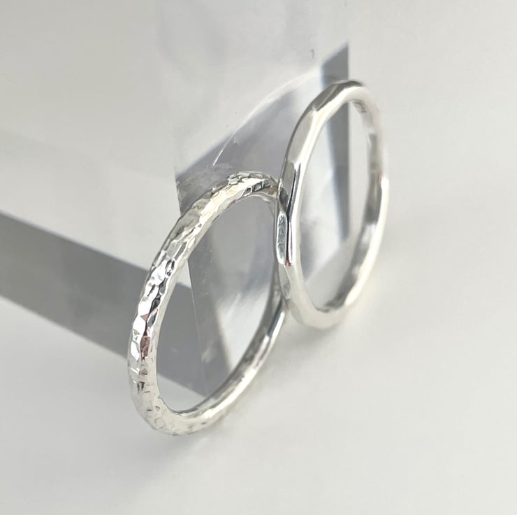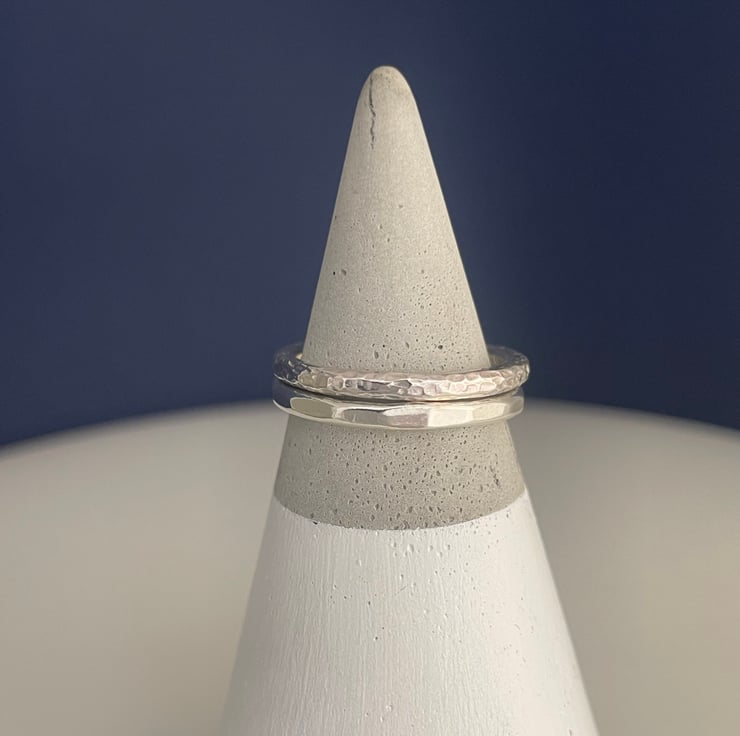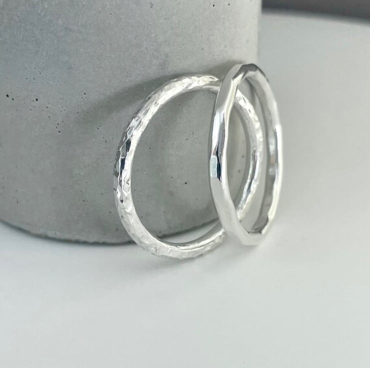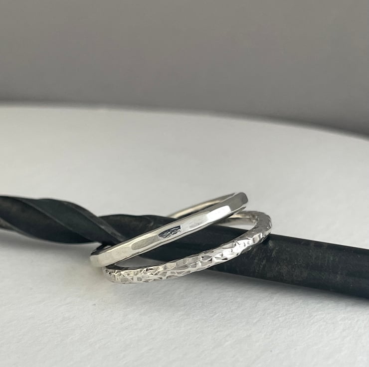A lovely set of two stacking rings handmade from 925 sterling silver. Cut by hand from solid 2mm thick silver wire, formed into rings then one hammered on all three sides to create a sparkly textured surface and the second hammered with a contrasting faceted surface.
