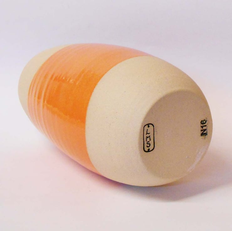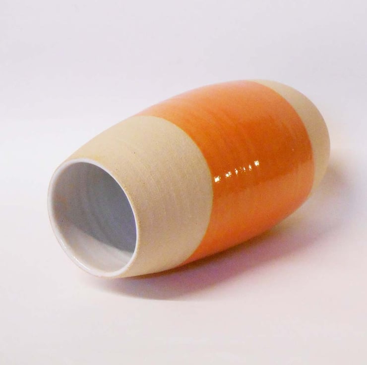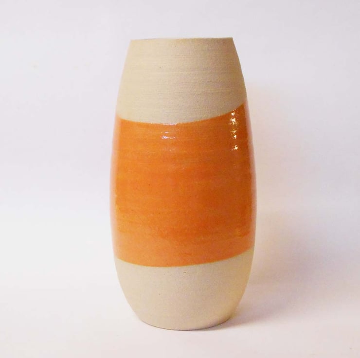 This is a wheel thrown durable stoneware Vase. It has been glazed on the interior with shiny Tin white glaze, and there is a "band" of shiny Neon Orange around the middle of the outside of the Vase. My unique Potters stamp and N16, the postcode of where it was made appear on the base. It is 20 cm high, the top is 7.5 cm across, and the base is 7 cm across.