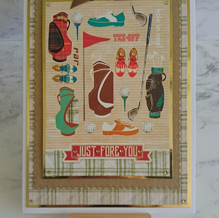 The design is a collage of golfing items. There are golf shoes, bags, clubs, balls, tees and flags. The sentiments say "par", "hole in one", "tee off" and "Just For You" and the card has been finished with gems.