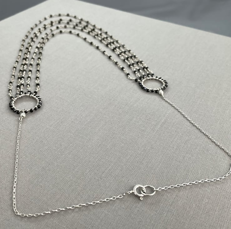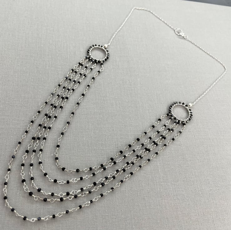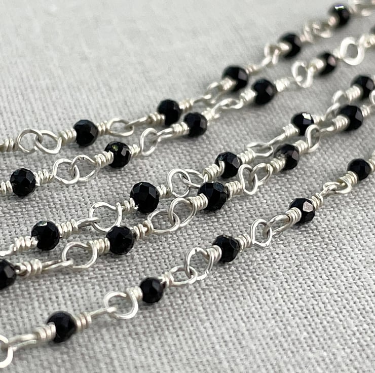 A truly pretty and delicate necklace featuring micro faceted black spinel and sterling silver. Each tiny spinel gemstone has been painstakingly micro rosary linked which took me a couple of days to make. The rings have been soldered by myself and wrapped with spinel. The entire necklace is of sterling silver.