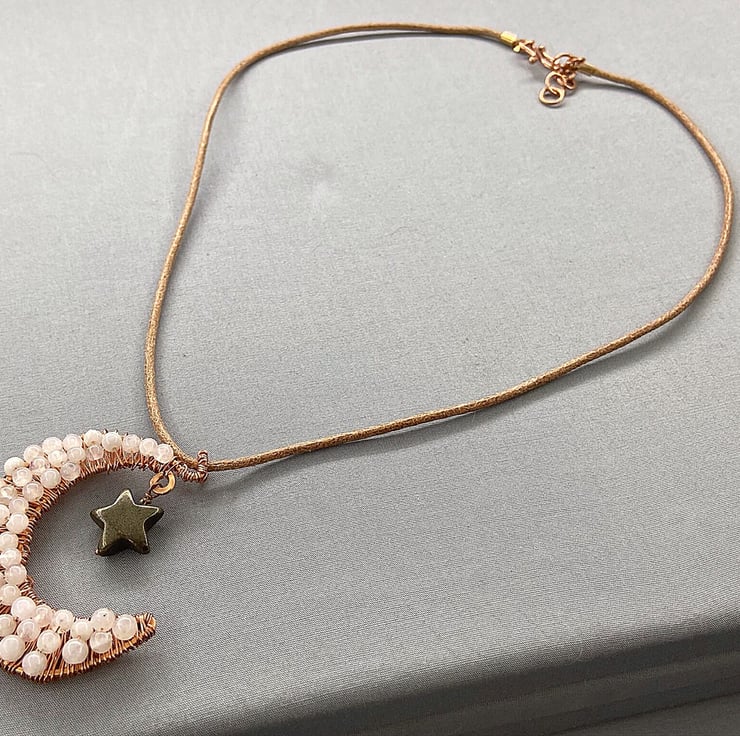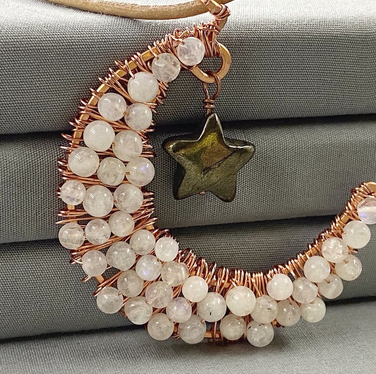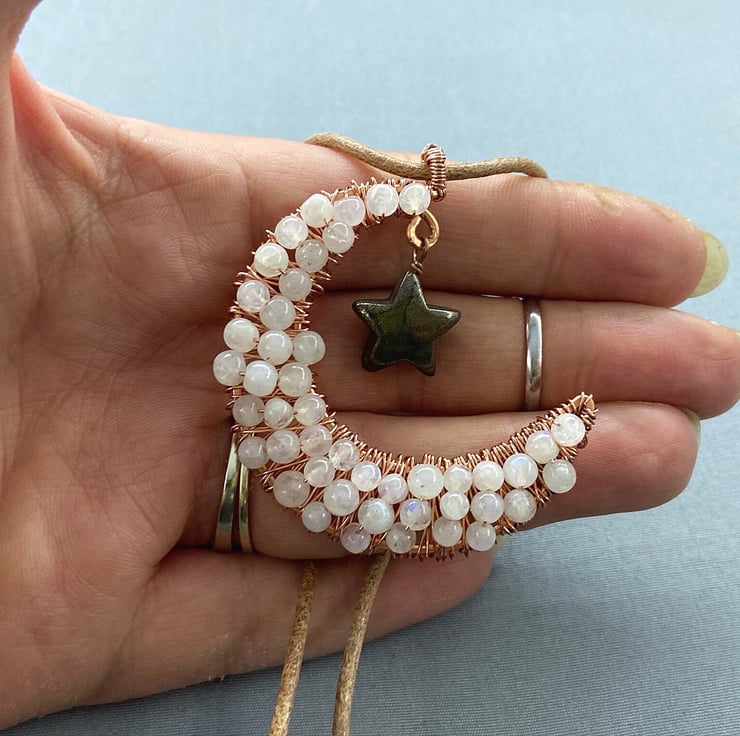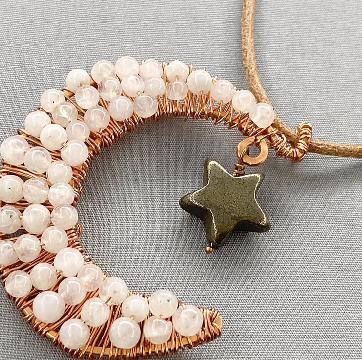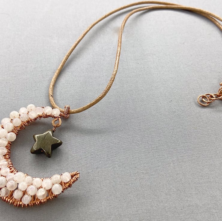 A completely handmade pendant made from copper wire which I incorporated rainbow Moonstone in the wire wraps. A pyrite star hangs from the crescent moon. The pendant is suspended from a tan coloured leather cord.