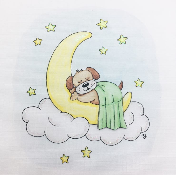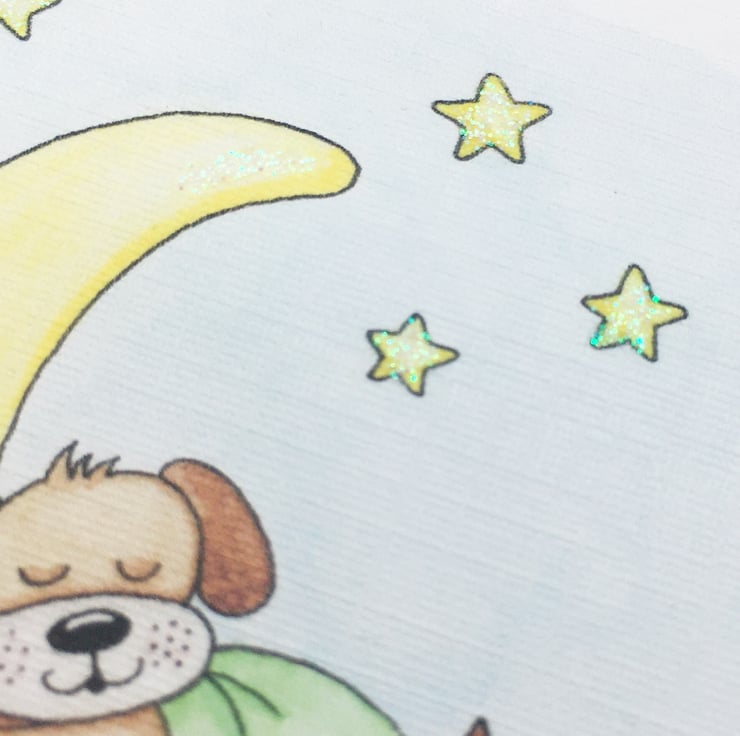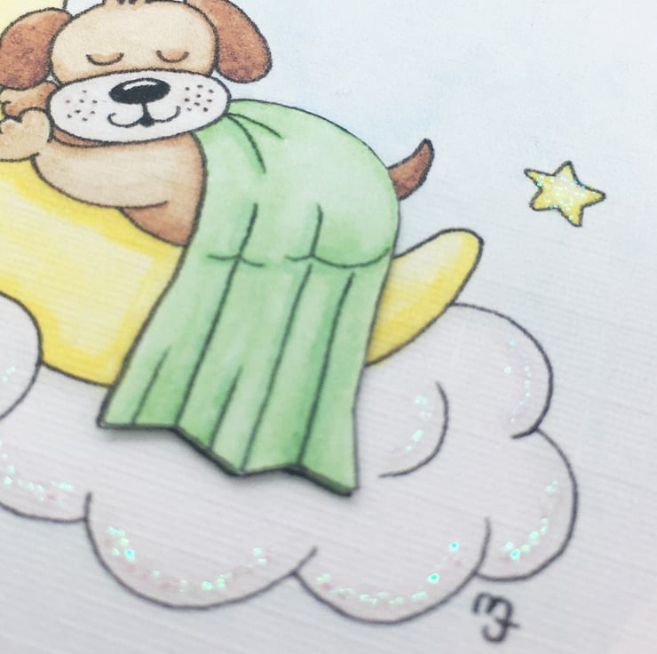 This cute Sleeping Pup card has been designed using my own original illustration. The image has been printed out onto good quality white linen embossed card and decoupaged up in parts. I have also added a little glitter detail.