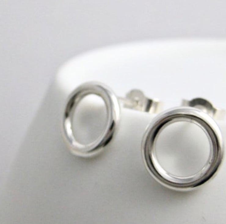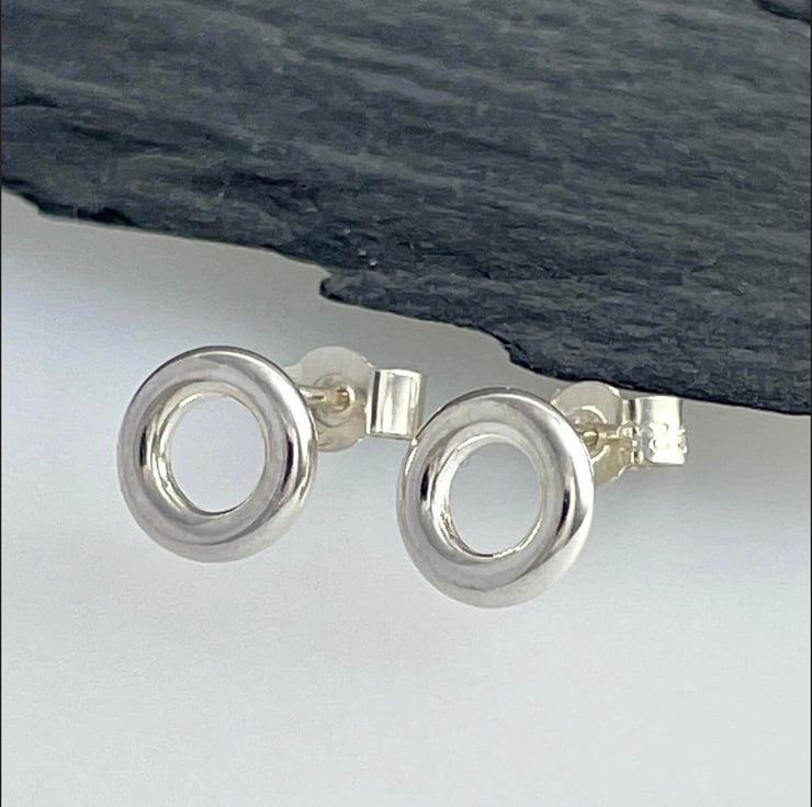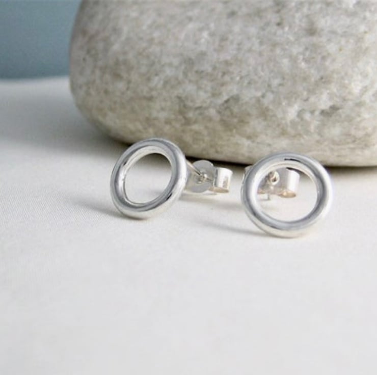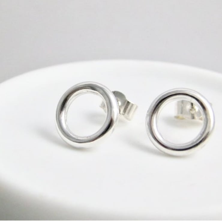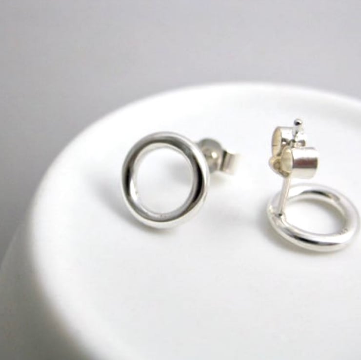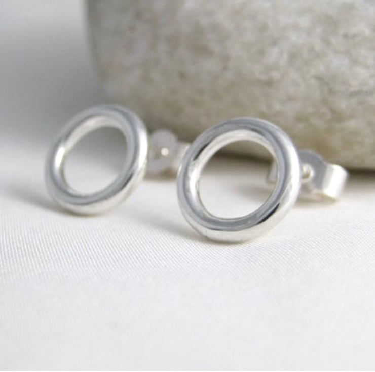 A lovely pair of chunky open circular ear stud earrings handmade from 925 sterling silver. Cut by hand from solid 2mm silver round wire, formed into circular shapes then worked to a plain/smooth surface. They have 11mm long silver pin fittings and secured with stamped (925) silver scroll’s/butterfly’s.