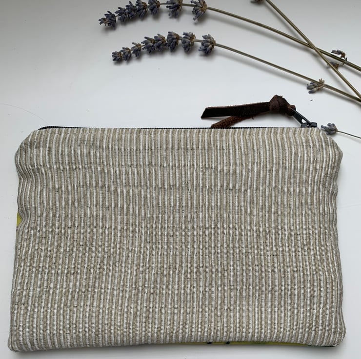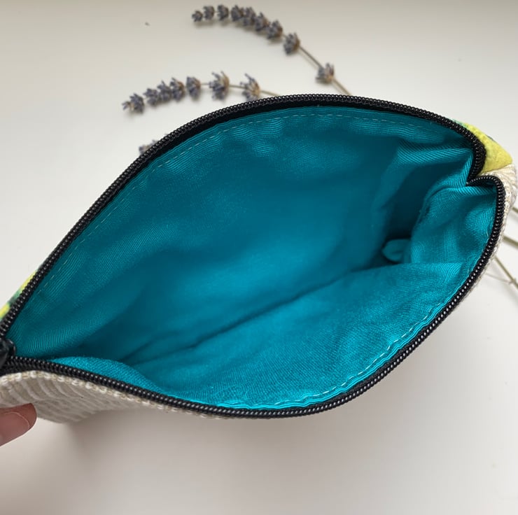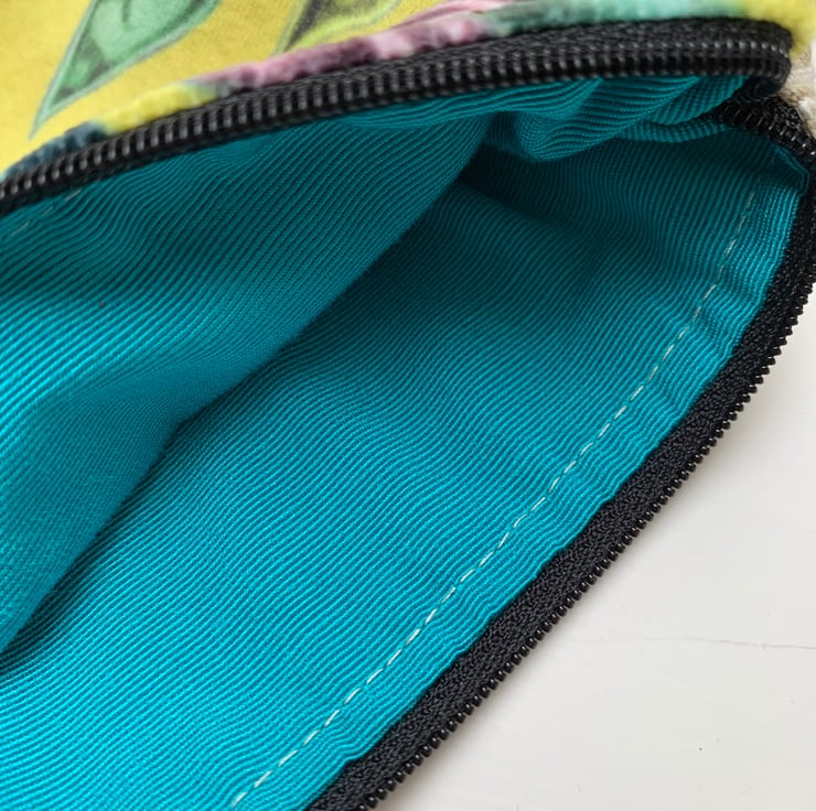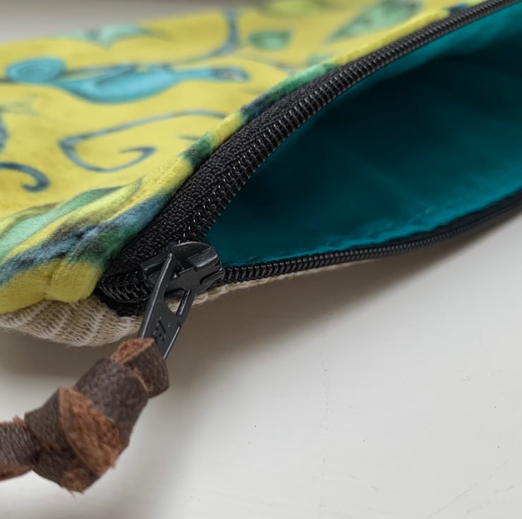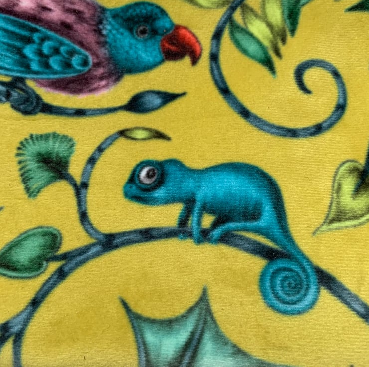 Beautiful soft zip pouch in Emma J Shipley Lime Rousseau velvet with a linen-mix back with a ribbed texture. The pouch is fully lined in blue-green fabric which picks out the colour of the bird and chameleon.