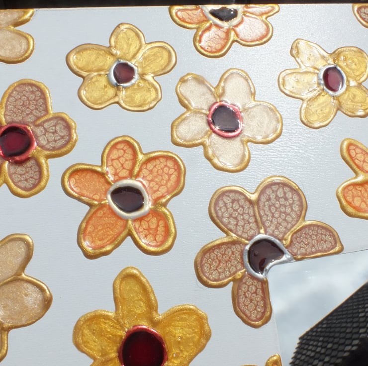 Each hand drawn flower starts with an outline of glass paint out-liner and then into each out-line is dropped opaque and textured glass paints -drip by drip.