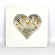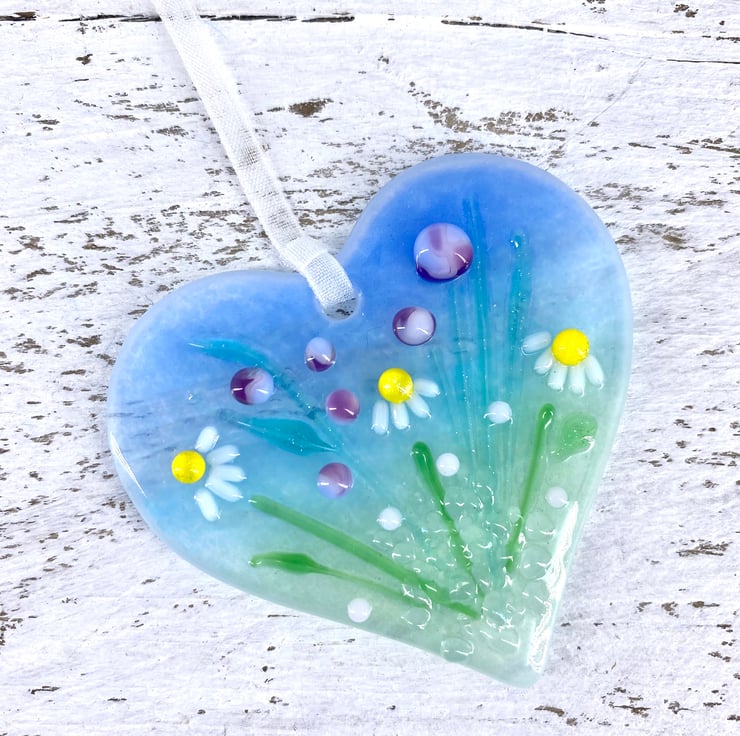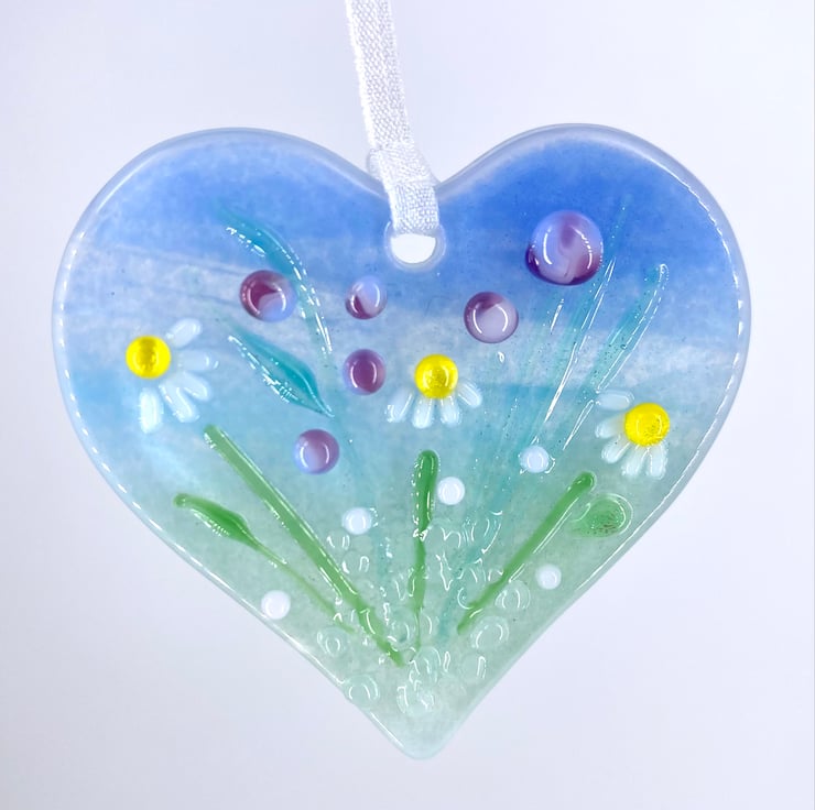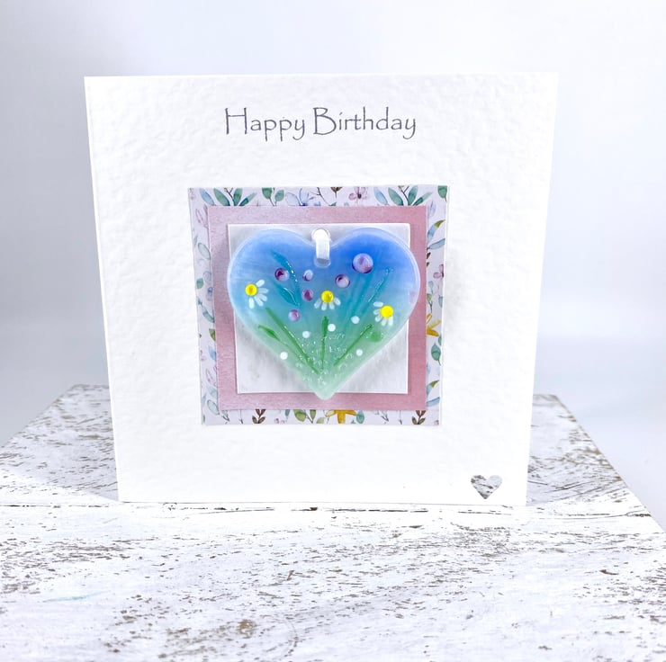 A lovely handmade card with a gorgeous fused glass heart with pretty pink flowers & daisies attached to it - the perfect card and gift in one!
